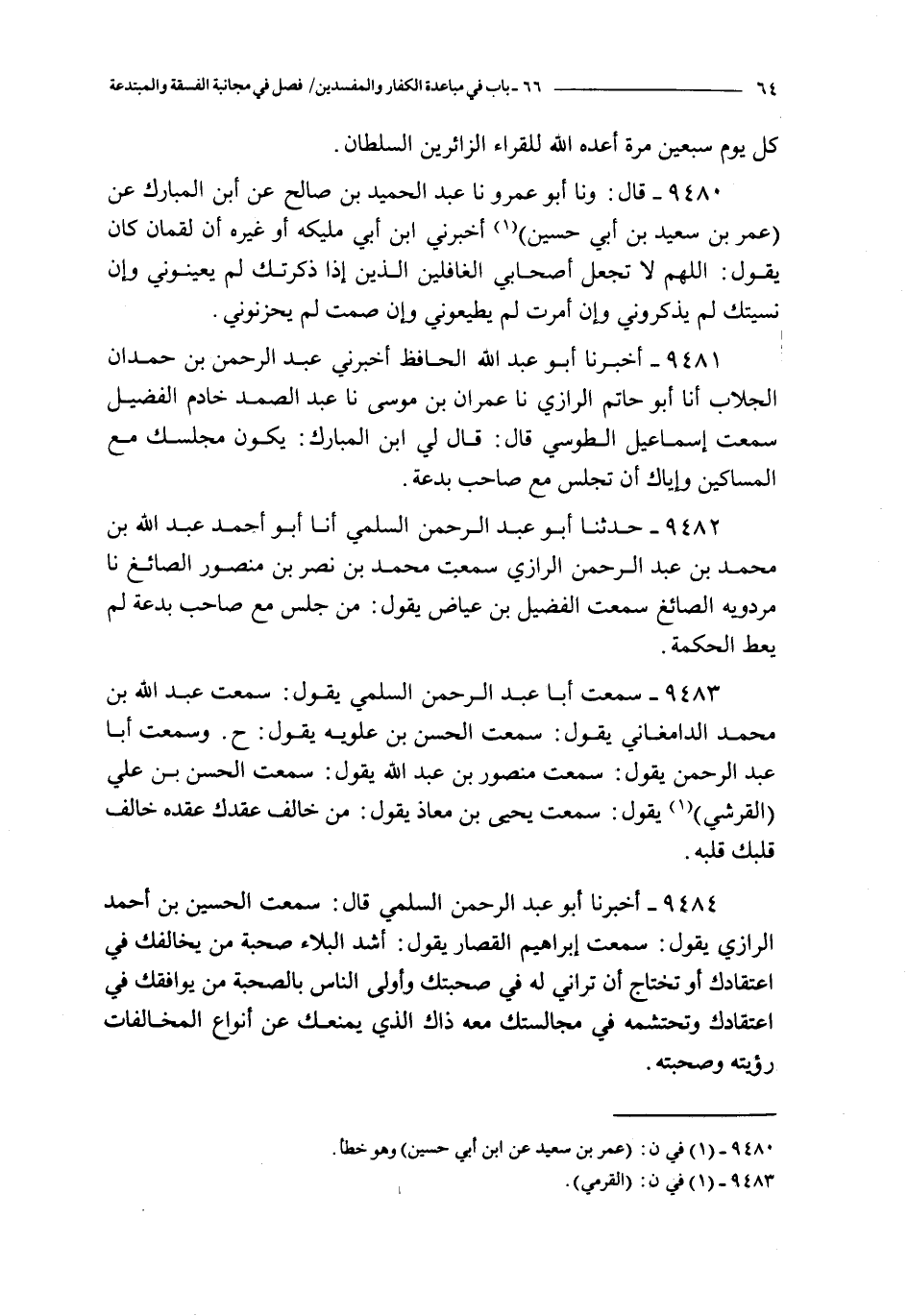 9482 - حدثنا أبو عبد الرحمن السلمي أنا أبو أحمد عبد الله بن محمد بن عبد الرحمن الرازي سمعت محمد بن نصر بن منصور الصائغ نا مردويه الصائغ سمعت الفضيل بن عياض يقول : من جلس مع صاحب بدعة لم يعط الحكمة