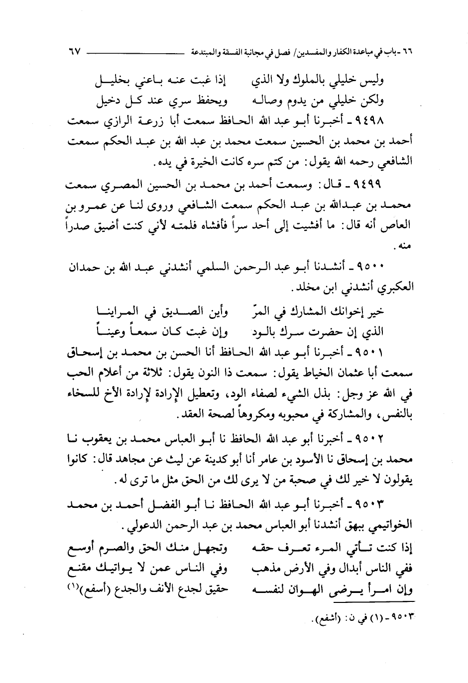 9500 - أنشدنا أبو عبد الرحمن السلمي أنشدني عبد الله بن حمدان العكبري أنشدني ابن مخلد : ـ ( خير إخوانك المشار في المر و أين الصديق في المراينا )