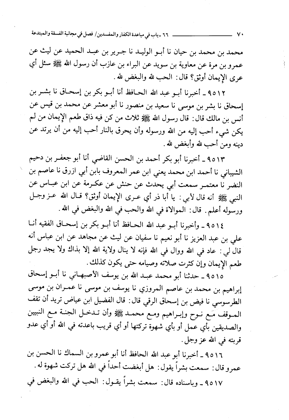 9513 - أخبرنا أبو بكر أحمد بن الحسن القاضي أنا أبو جعفر بن دحيم الشيباني نا أحمد بن محمد يعني ابن عمر المعروف بابن أزرق نا عاصم بن النضر نا معتمر سمعت أبي يحدث عن حنش عن عكرمة عن ابن عباس : عن النبي صلى الله عليه و سلم أنه قال لأبي : يا أبا ذر أي عرى الإيمان أوثق ؟ قال الله عز و جل و رسوله أعلم قال : الموالاة في الله و الحب في الله و البغض في الله
