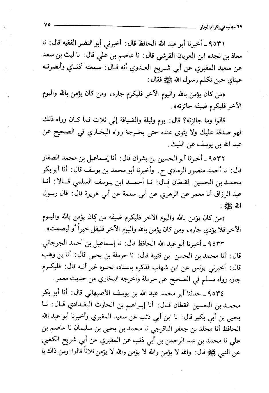 9531 - أخبرنا أبو عبد الله الحافظ قال : أخبرني أبو النضر الفقيه قال : نا معاذ بن نجدة ابن العريان القرشي قال : نا عاصم بن علي قال : نا ليث بن سعد عن سعيد المقبري عن أبي شريح العدوي أنه قال : سمعته أذناي و أبصرته عيناي حين تكلم رسول الله صلى الله عليه و سلم فقال : من كان يؤمن بالله و اليوم الآخر فليكرم جاره و من كان يؤمن بالله و اليوم الآخر فليكرم ضيفه جائزته
