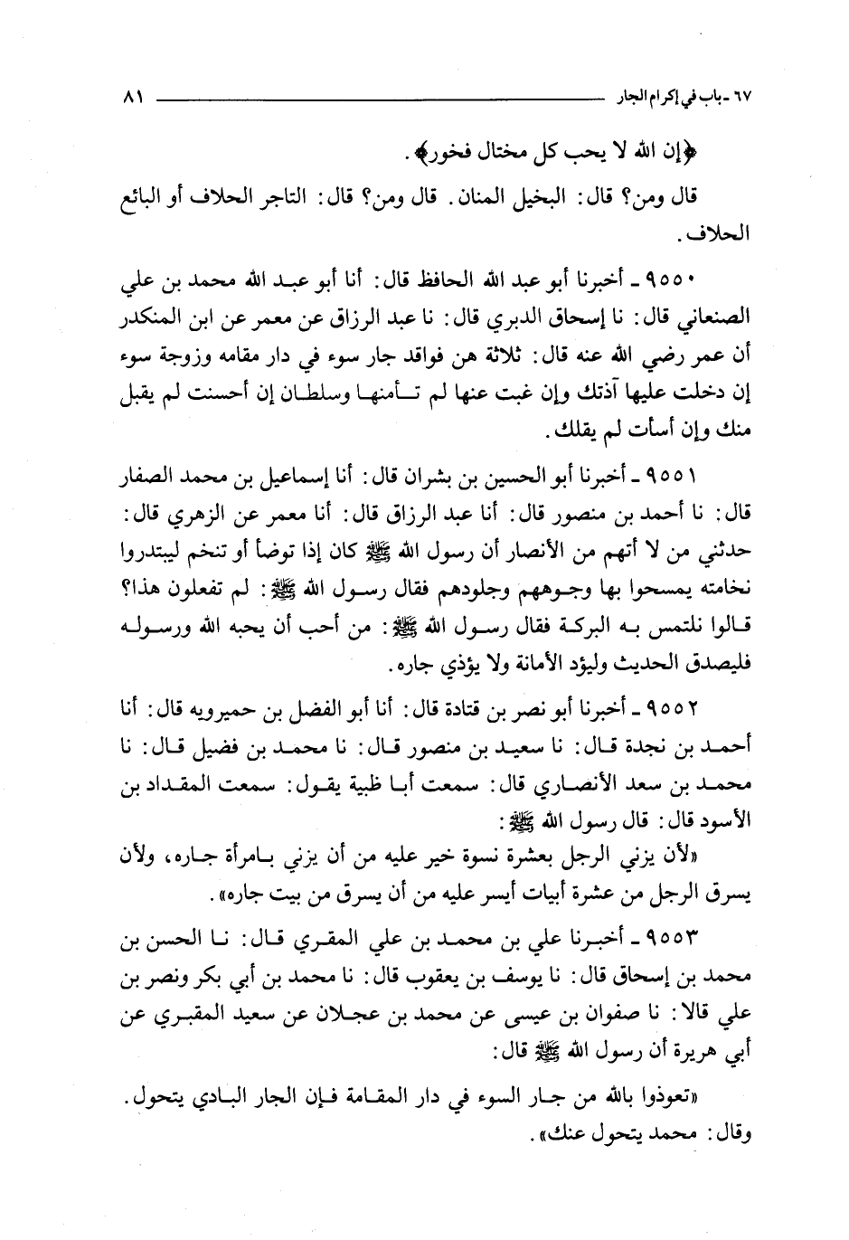9550 - أخبرنا أبو عبد الله الحافظ قال : أنا أبو عبد الله محمد بن علي الصنعاني قال : نا إسحاق الدبري قال : نا عبد الرزاق عن معمر عن ابن المنكدر أن عمر رضي الله عنه قال : ثلاثة هن فواقد جار سوء في دار مقامه و زوجة سوء إن دخلت عليها آذتك و إن غبت عنها لم تأمنها و سلطان إن أحسنت لم يقبل منك و إن أسأت لم يقلك