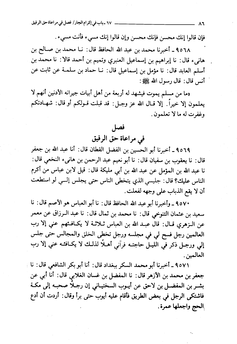 9571 - أخبرنا أبو محمد السكر ببغداد قال : أنا أبو بكر الشافعي قال : نا جعفر بن محمد بن الأزهر قال : نا المفضل بن غسان الغلابي قال : أنا أبي عن بشر بن المفضل بن لاحق عن أيوب السختياني : إن رجلا صحبه إلى مكة فاشتكى الرجل في بعض الطريق فأقام عليه أيوب حتى برأ و قال : أردت أن أدع الحج و أجعلها عمرة