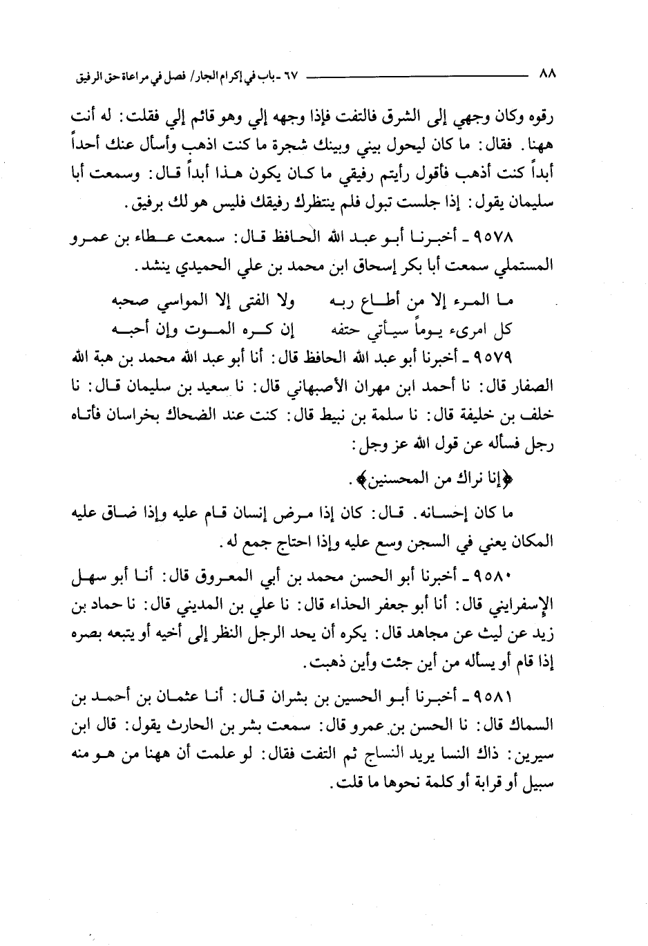 9580 - أخبرنا أبو الحسن محمد بن أبي المعروق قال : أنا أبو سهل الإسفرايني قال : أنا أبو جعفر الحذاء قال : نا علي ابن المديني قال : نا حماد بن زيد عن ليث عن مجاهد قال : يكره أن يحد الرجل النظر إلى أخيه أو يتبعه بصره إذا قام أو يسأله من أين جئت و أين ذهبت