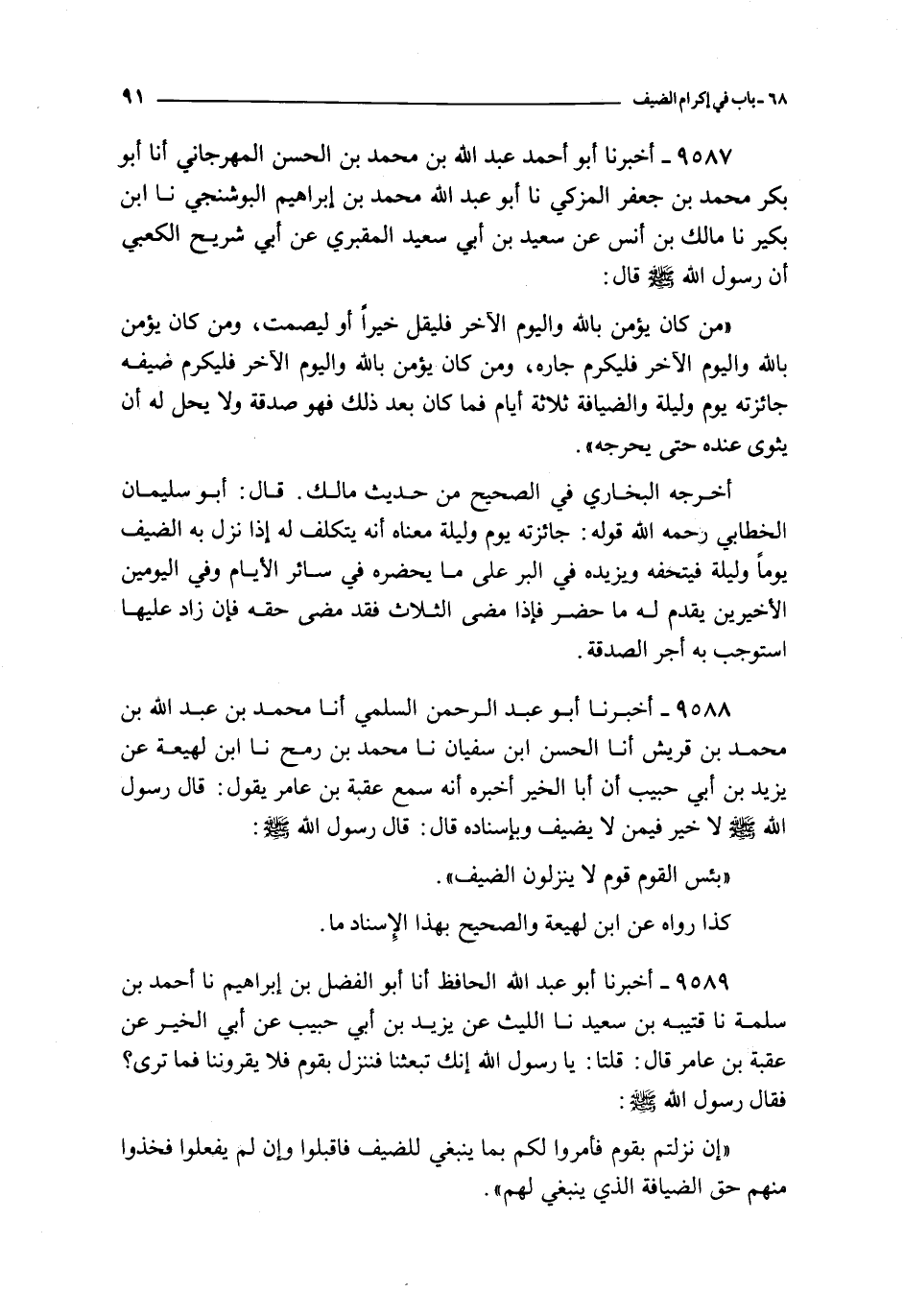 9587 - أخبرنا أبو أحمد عبد الله بن محمد بن الحسن المهرجاني أنا أبو بكر محمد بن جعفر المزكي نا أبو عبد الله محمد بن إبراهيم البوشنجي نا ابن بكير نا مالك بن أنس عن سعيد بن أبي سعيد المقبري عن أبي شريح الكعبي : أن رسول الله صلى الله عليه و سلم قال : من كان يؤمن بالله و اليوم الآخر فليقل خيرا أو ليصمت و من كان يؤمن بالله و اليوم الآخر فليكرم جاره و من كان يؤمن بالله و اليوم الآخر فليكرم ضيفه جائزته يوم و ليلة و الضيافة ثلاثة أيام فما كان بعد ذلك فهو صدقة و لا يحل له أن يثوى عنده حتى يحرجه