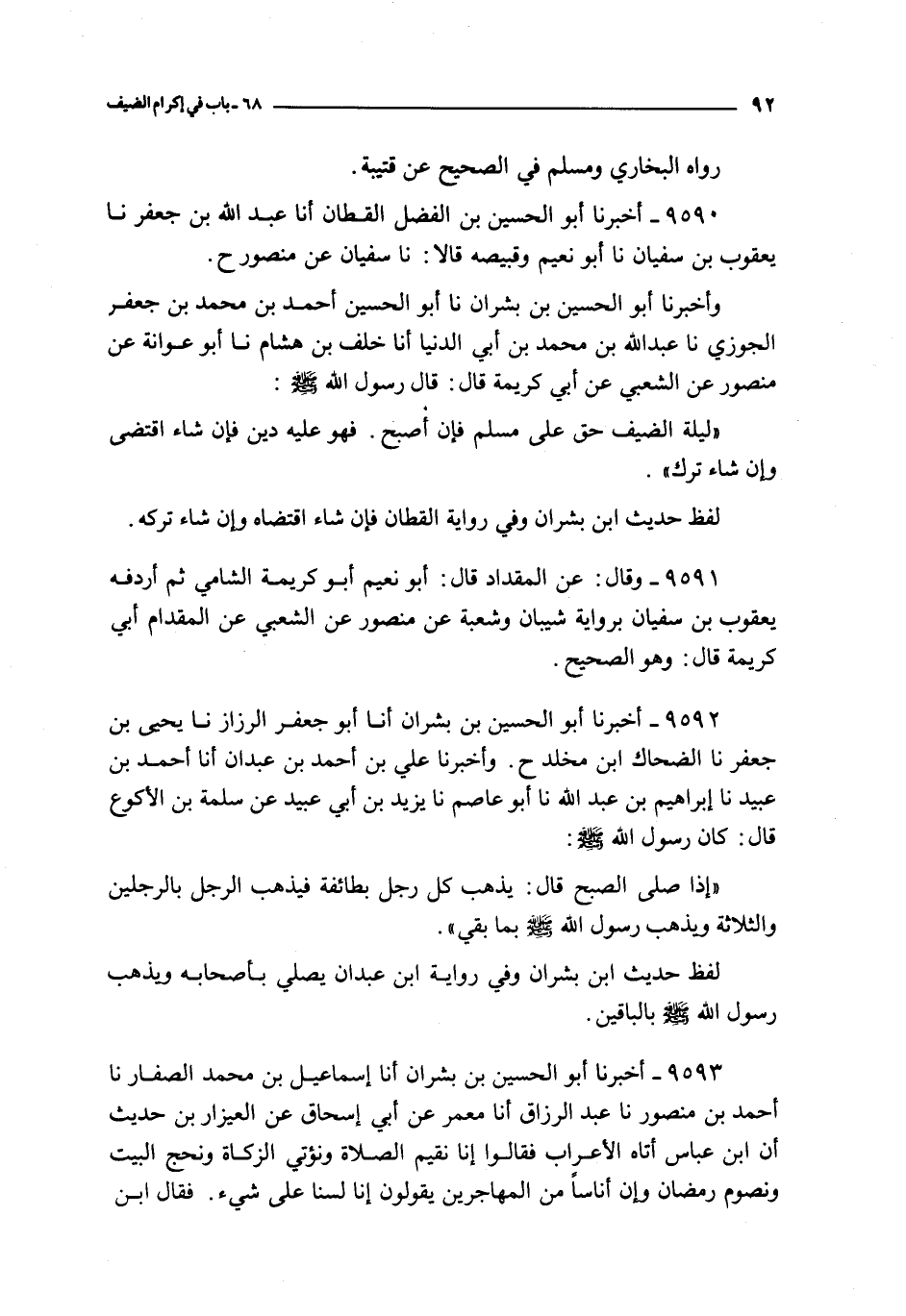 و أخبرنا أبو الحسين بن بشران نا أبو الحسين أحمد بن محمد بن جعفر الجوزي نا عبد الله بن محمد بن أبي الدنيا أنا خلف بن هشام نا أبو عوانة عن منصور عن الشعبي عن أبي كريمة قال : قال رسول الله صلى الله عليه و سلم : ليلة الضيف حق على مسلم فإن أصبح فهو عليه دين فإن شاء اقتضى و إن شاء ترك