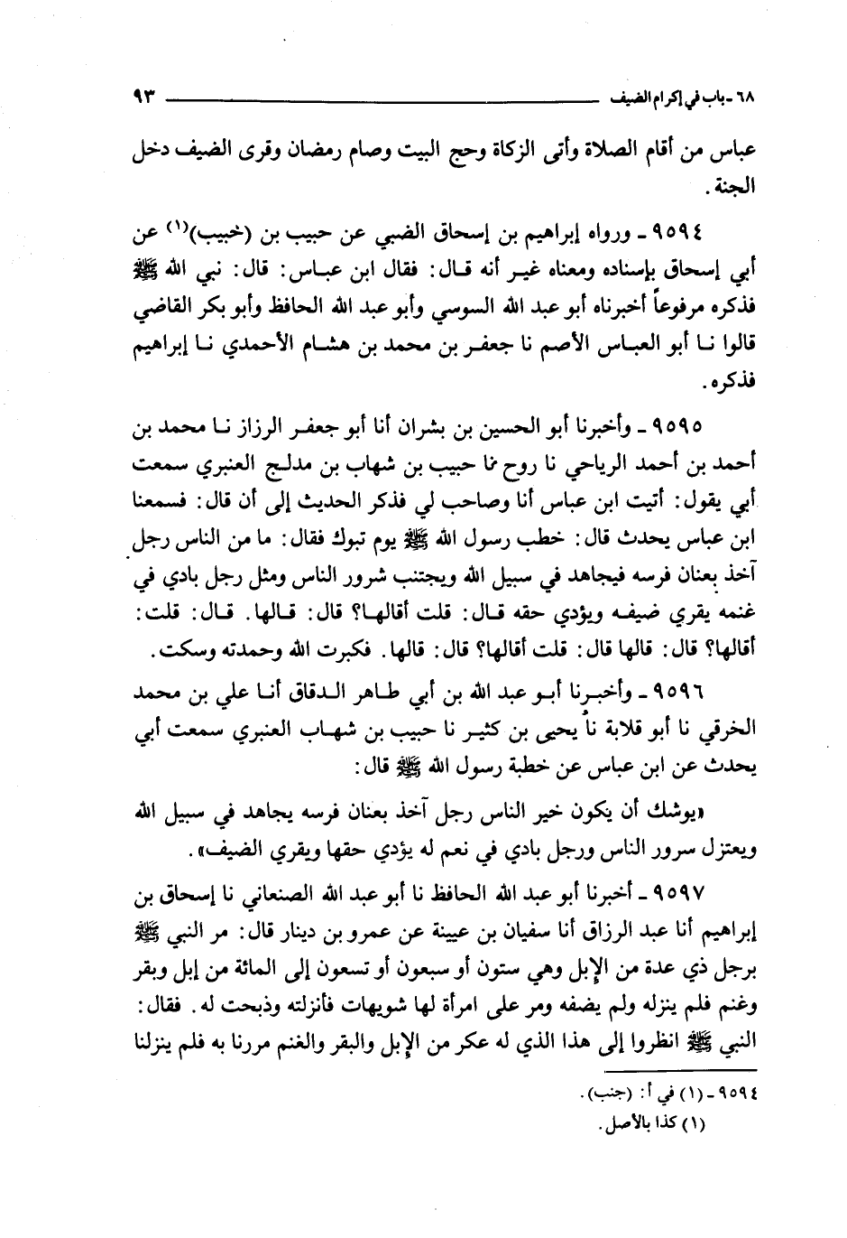 9595 - و أخبرنا أبو الحسين بن بشران أنا أبو جعفر الرزاز نا محمد بن أحمد بن أحمد الرياحي نا روح نا حبيب بن شهاب بن مدلج العنبري سمعت أبي يقول : أتيت ابن عباس أنا و صاحب لي فذكر الحديث إلى أن قال : فسمعنا ابن عباس يحدث قال : خطب رسول الله صلى الله عليه و سلم يوم تبوك فقال : ما من الناس رجل آخذ بعنان فرسه فيجاهد في سبيل الله و يجتنب شرور الناس و مثل رجل بادي في غنمه يقري ضيفه و يؤدي حقه قال : قلت أقالها ؟ قال : قالها قال : قلت : أقالها ؟ قال : قالها قال : قلت أقالها ؟ قال : قالها فكبرت الله و حمدته و سكت