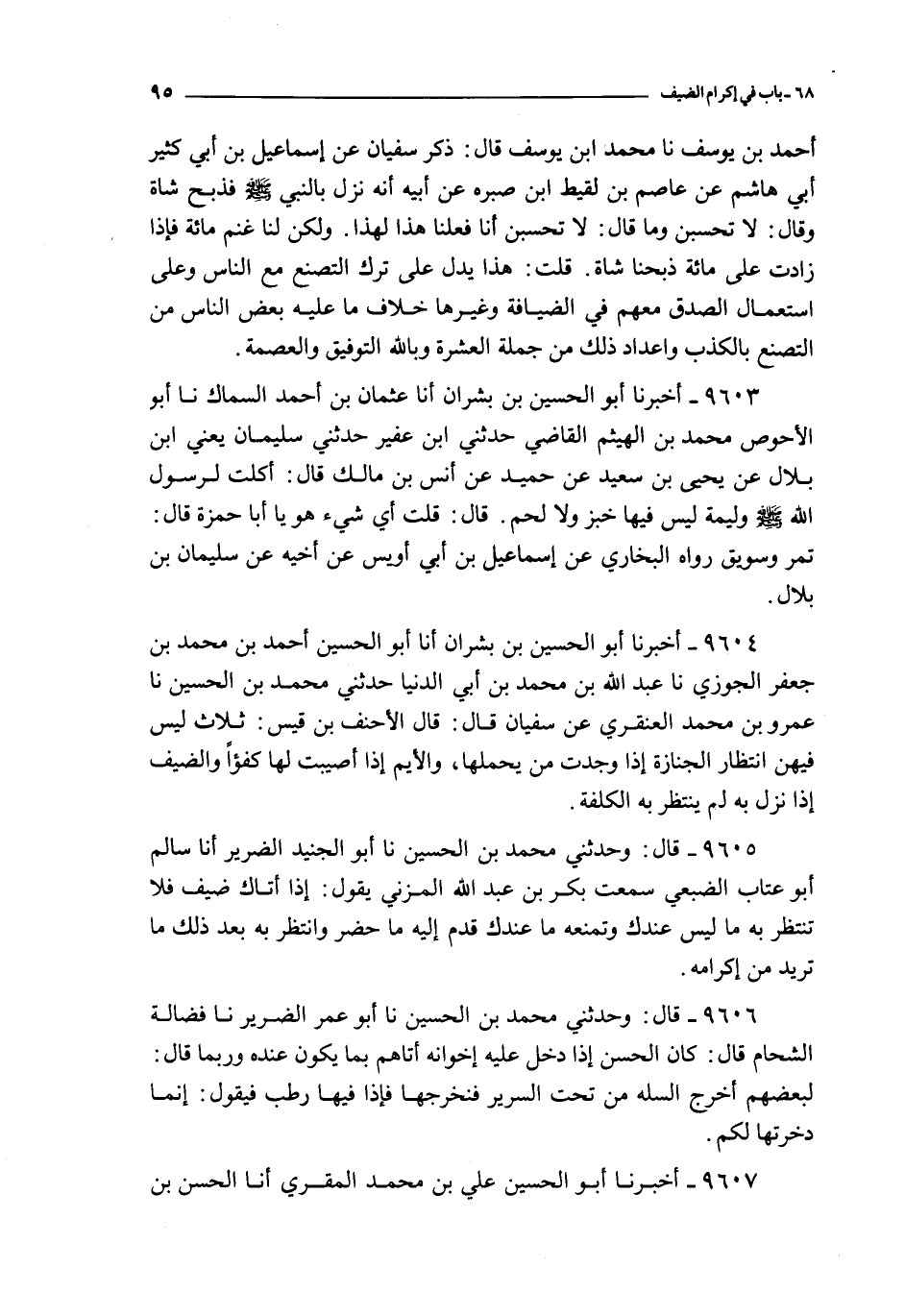 9605 - قال : و حدثني محمد بن الحسين نا أبو الجنيد الضرير أنا سالم أبو عتاب الضبعي سمعت بكر بن عبد الله المزني يقول : إذا أتاك ضيف فلا تنتظر به ما ليس عندك و تمنعه ما عندك قدم إليه ما حضر و انتظر به بعد ذلك ما تريد من إكرامه