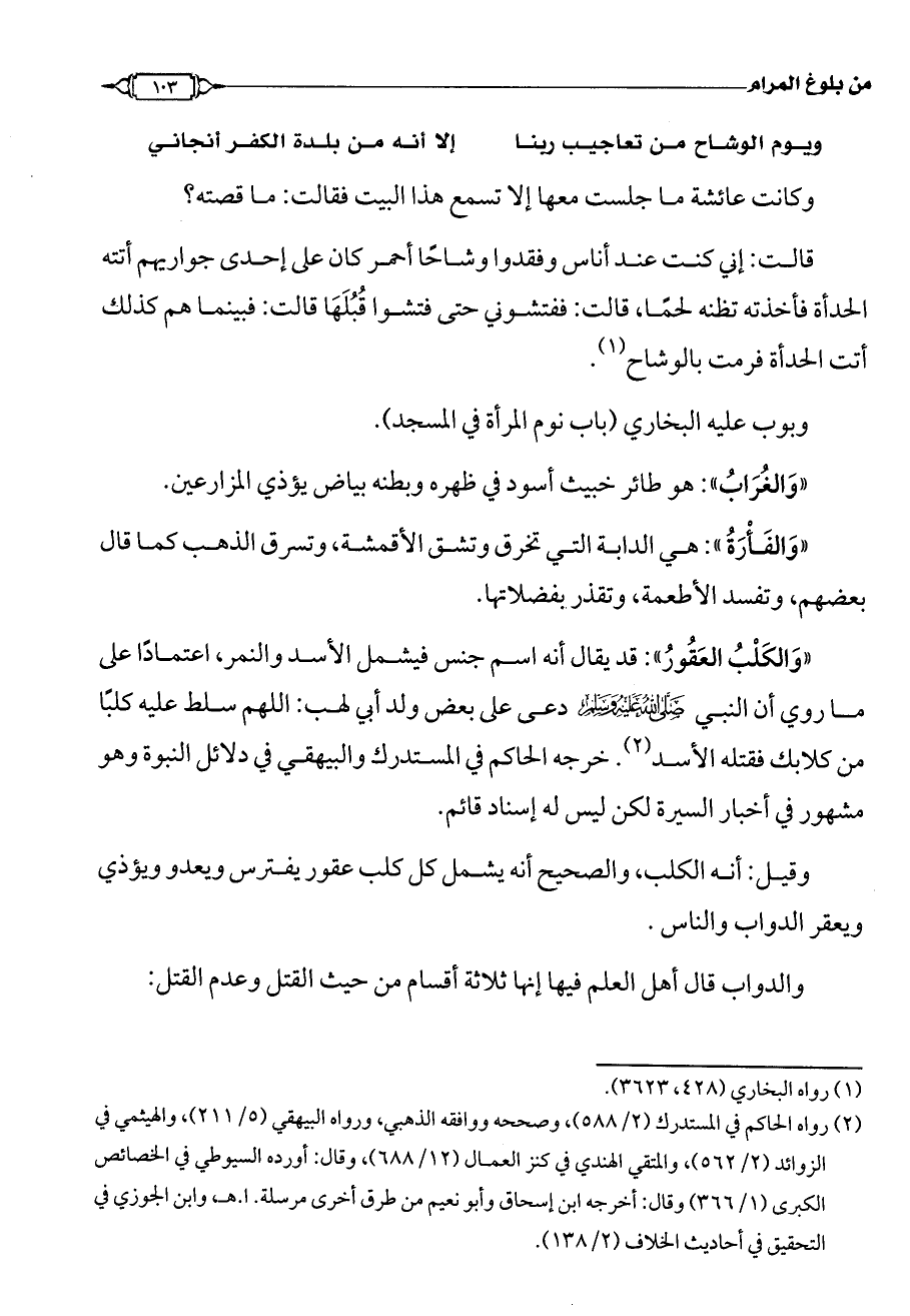 «وَالكَلْبُ العَقُورُ»: قد يقال أنه اسم جنس فيشمل الأسد والنمر، اعتمادًا على ما روي أن النبي دعى على بعض ولد أبي لهب: اللهم سلط عليه كلبًا من كلابك فقتله الأسد (¬2). خرجه الحاكم في المستدرك والبيهقي في دلائل النبوة وهو مشهور في أخبار السيرة لكن ليس له إسناد قائم.