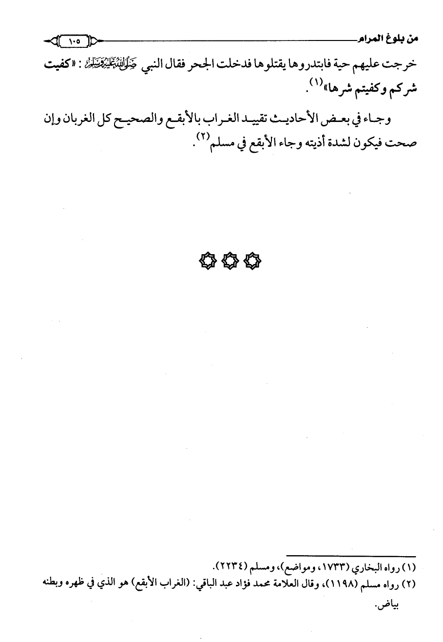 (¬2) رواه مسلم (1198)، وقال العلامة محمد فؤاد عبد الباقي: (الغراب الأبقع) هو الذي في ظهره وبطنه بياض.