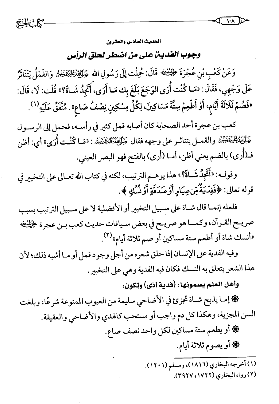 وَعَنْ كَعْبِ بْنِ عُجْرَةَ - رضي الله عنه - قَالَ: حُمِلْت إلَى رَسُولِ اللهِ - صلى الله عليه وسلم - وَالقَمْلُ يَتَنَاثَرُ عَلَى وَجْهِي، فَقَالَ: «مَا كُنْت أُرَى الوَجَعَ بَلَغَ بِك مَا أَرَى، أَتَجِدُ شَاةً؟» قُلْت: لَا، قَالَ: «فَصُمْ ثَلَاثَةَ أَيَّامٍ، أَوْ أُطْعِمْ سِتَّةَ مَسَاكِينَ، لِكُلِّ مِسْكِينٍ نِصْفُ صَاعٍ» [مُتَّفْقٌ عَلَيْهِ] (¬1).