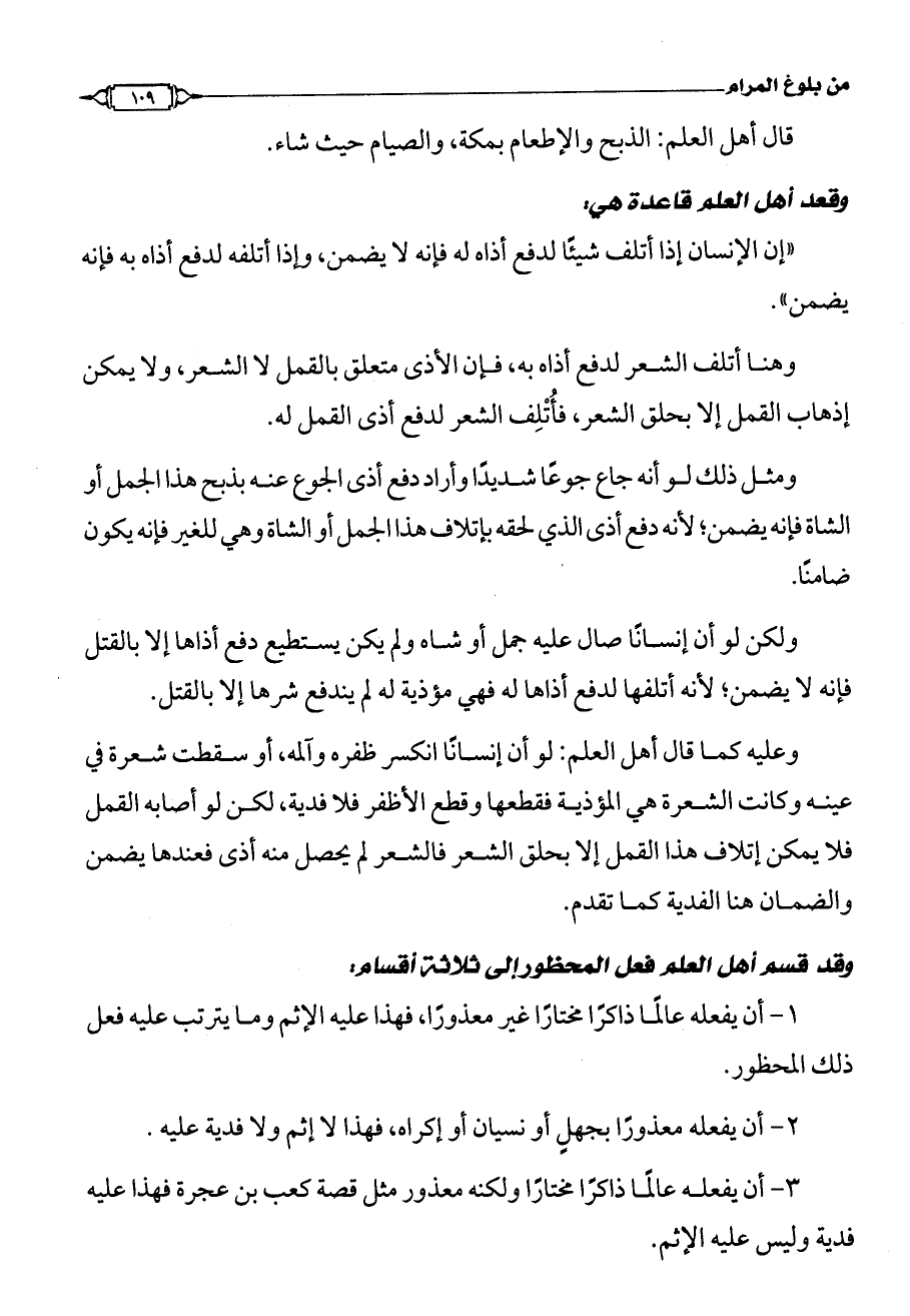وعليه كما قال أهل العلم: لو أن إنسانًا انكسر ظفره وآلمه، أو سقطت شعرة في عينه وكانت الشعرة هي المؤذية فقطعها وقطع الأظفر فلا فدية، لكن لو أصابه القمل فلا يمكن إتلاف هذا القمل إلا بحلق الشعر فالشعر لم يحصل منه أذى فعندها يضمن والضمان هنا الفدية كما تقدم.