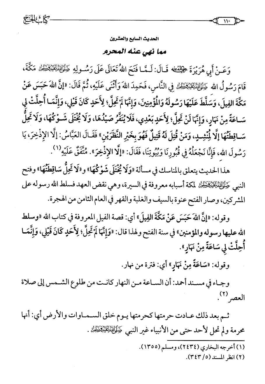وَعَنْ أَبِي هُرَيْرَةَ - رضي الله عنه - قَالَ: لَمَّا فَتَحَ اللهُ تَعَالَى عَلَى رَسُولِهِ - صلى الله عليه وسلم - مَكَّةَ، قَامَ رَسُولُ اللهِ - صلى الله عليه وسلم - فِي النَّاسِ، فَحَمِدَ اللهَ وَأَثْنَى عَلَيْهِ، ثُمَّ قَالَ: «إنَّ اللهَ حَبَسَ عَنْ مَكَّةَ الفِيلَ، وَسَلَّطَ عَلَيْهَا رَسُولَهُ وَالمُؤْمِنِينَ، وَإِنَّهَا لَمْ تَحِلَّ؛ لِأَحَدٍ كَانَ قَبْلِي، وَإِنَّمَا أُحِلَّتْ لِي سَاعَةً مِنْ نَهَارٍ، وَإِنَّهَا لَنْ تَحِلَّ؛ لِأَحَدٍ بَعْدِي، فَلَا يُنَفَّرُ صَيْدُهَا، وَلَا يُخْتَلَى شَوْكُهَا، وَلَا تَحِلُّ سَاقِطَتُهَا إِلَّا لِمُنْشِدٍ، وَمَنْ قُتِلَ لَهُ قَتِيلٌ فَهُوَ بِخَيْرِ النَّظَرَيْنِ» فَقَالَ العَبَّاسُ: إلَّا الإِذْخِرَ، يَا رَسُولَ اللهِ، فَإِنَّا نَجْعَلُهُ فِي قُبُورِنَا وَبُيُوتِنَا، فَقَالَ: «إِلَّا الإِذْخِرَ» [مُتَّفَقٌ عَلَيْهِ] (¬1).