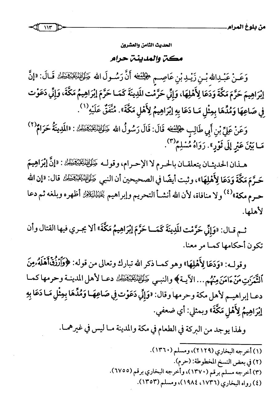 وَعَنْ عَبْدِ اللهِ بْنِ زَيْدِ بْنِ عَاصِمٍ - رضي الله عنه - أَنَّ رَسُولَ اللهِ - صلى الله عليه وسلم - قَالَ: «إِنَّ إِبْرَاهِيم حَرَّمَ مَكَّةَ وَدَعَا لِأَهْلِهَا، وَإِنِّي حَرَّمْت المَدِينَةَ كَمَا حَرَّمَ إبْرَاهِيمُ مَكَّةَ، وَإِنِّي دَعَوْت فِي صَاعِهَا وَمُدِّهَا بِمِثْلِ مَا دَعَا بِهِ إِبْرَاهِيمُ لِأَهْلِ مَكَّةَ» [مُتَّفَقٌ عَلَيْهِ] (¬1).