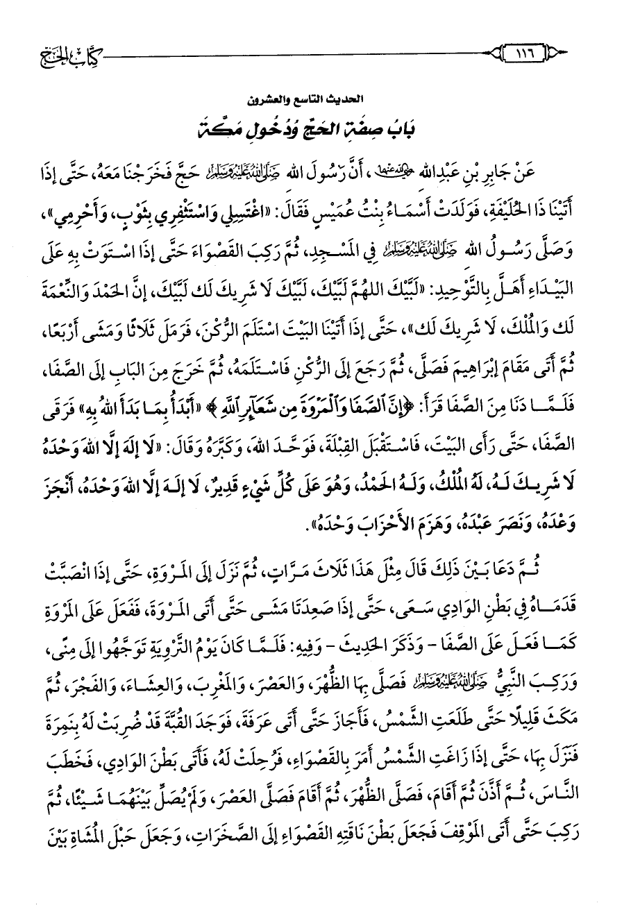 عَنْ جَابِرِ بْنِ عَبْدِ اللهِ - رضي الله عنهما -، أَنَّ رَسُولَ اللهِ - صلى الله عليه وسلم - حَجَّ فَخَرَجْنَا مَعَهُ، حَتَّى إذَا أَتَيْنَا ذَا الحُلَيْفَةِ، فَوَلَدَتْ أَسْمَاءُ بِنْتُ عُمَيْسٍ فَقَالَ: «اغْتَسِلِي وَاسْتَثْفِرِي بِثَوْبٍ، وَأَحْرِمِي»، وَصَلَّى رَسُولُ اللهِ - صلى الله عليه وسلم - فِي المَسْجِدِ، ثُمَّ رَكِبَ القَصْوَاءَ حَتَّى إذَا اسْتَوَتْ بِهِ عَلَى البَيْدَاءِ أَهَلَّ بِالتَّوْحِيدِ: «لَبَّيْكَ اللهُمَّ لَبَّيْكَ، لَبَّيْكَ لَا شَرِيكَ لَك لَبَّيْكَ، إنَّ الحَمْدَ وَالنِّعْمَةَ لَك وَالمُلْكَ، لَا شَرِيكَ لَك»، حَتَّى إذَا أَتَيْنَا البَيْتَ اسْتَلَمَ الرُّكْنَ، فَرَمَلَ ثَلَاثًا وَمَشَى أَرْبَعًا، ثُمَّ أَتَى مَقَامَ إبْرَاهِيمَ فَصَلَّى، ثُمَّ رَجَعَ إلَى الرُّكْنِ فَاسْتَلَمَهُ، ثُمَّ خَرَجَ مِنَ البَابِ إلَى الصَّفَا، فَلَمَّا دَنَا مِنَ الصَّفَا قَرَأَ. {إِنَّ الصَّفَا وَالْمَرْوَةَ مِنْ شَعَائِرِ اللَّهِ} [البقرة: 158] «أَبْدَأُ بِمَا بَدَأَ اللهُ بِهِ» فَرَقَى الصَّفَا، حَتَّى رَأَى البَيْتَ، فَاسْتَقْبَلَ القِبْلَةَ، فَوَحَّدَ اللهَ، وَكَبَّرَهُ وَقَالَ: «لَا إلَهَ إلَّا اللهَ وَحْدَهُ لَا شَرِيكَ لَهُ، لَهُ المُلْكُ، وَلَهُ الحَمْدُ، وَهُوَ عَلَى كُلِّ شَيْءٍ قَدِيرٌ، لَا إلَهَ إلَّا اللهَ وَحْدَهُ، أَنْجَزَ وَعْدَهُ، وَنَصَرَ عَبْدَهُ، وَهَزَمَ الأَحْزَابَ وَحْدَهُ».