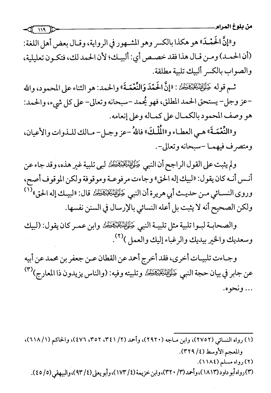 ولم يثبت على القول الراجح أن النبي - صلى الله عليه وسلم - لبى تلبية غير هذه، وقد جاء عن أنس أنه كان يقول: «لبيك إله الحق» وجاءت مرفوعة وموقوفة ولكن الموقوف أصح، وروى النسائي من حديث أبي هريرة أن النبي - صلى الله عليه وسلم - قال: «لبيك إله الحق» (¬1) ولكن الصحيح أنه لا يثبت بل أعله النسائي بالإرسال في السنن نفسها.