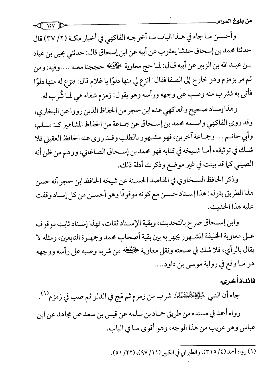 وأحسن ما جاء في هذا الباب ما أخرجه الفاكهاني في أخبار مكة (2/ 37) قال حدثنا محمد بن إسحاق حدثنا يعقوب عن أبيه قال: لما حج معاوية - رضي الله عنه - حججنا معه .... وفيه: ومن ثم مر بزمزم وهو خارج إلى الصفا فقال: انزع لي منها دلوًا يا غلام قال: فنزع له منها دلوًا فأتى به فشرب منه وصب عل وجهه ورأسه وهو يقول: زمزم شفاء هي لما شُرب له.