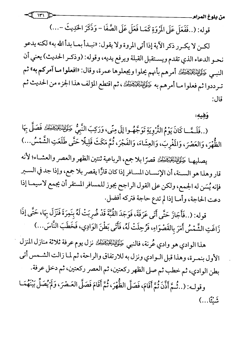 لكن لا يكرر ذكر الآية إذا أتى المروة ولا يقول: «نبدأ بما بدأ الله به» لكنه يدعو نحو الدعاء الذي تقدم ويستقبل القبلة ويرفع يديه، وقوله: (وذكر الحديث) يعني أن النبي - صلى الله عليه وسلم - أمرهم بأنهم يجلوا ويجعلوها عمرة، وقال: «افعلوا ما آمركم به» ثم ترددوا ثم فعلوا ما أمرهم به - صلى الله عليه وسلم - وي، ثم اقتطع المؤلف هذا الجزء من الحديث ثم قال: