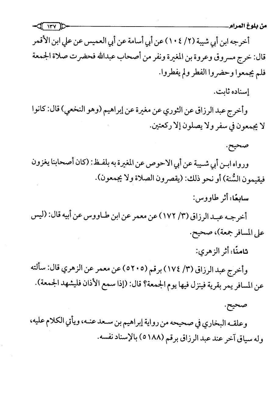 ورواه ابن أبي شيبه عن أبي الاحوص عن المغيرة به بلفظ: (كان أصحابنا يغزون فيقيمون السُّنة) أو نحو ذلك: (يقصرون الصلاة ولا يجمعون).