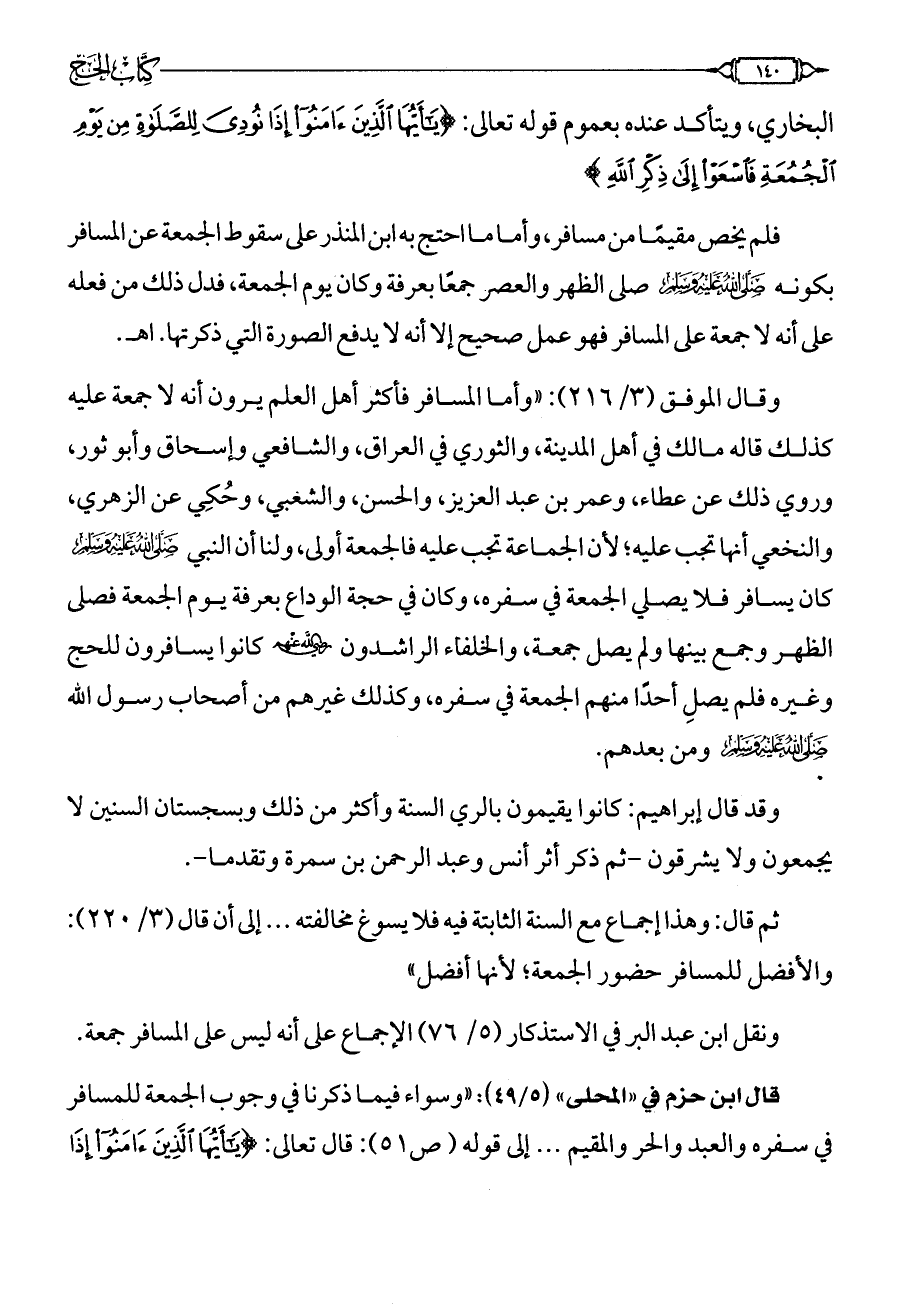 ثم قال: وهذا إجماع من السنة الثابتة فيه فلا يسوغ مخالفته ... إلى أن قال (3/ 220): والأفضل للمسافر حضور الجمعة؛ لأنها أفضل».