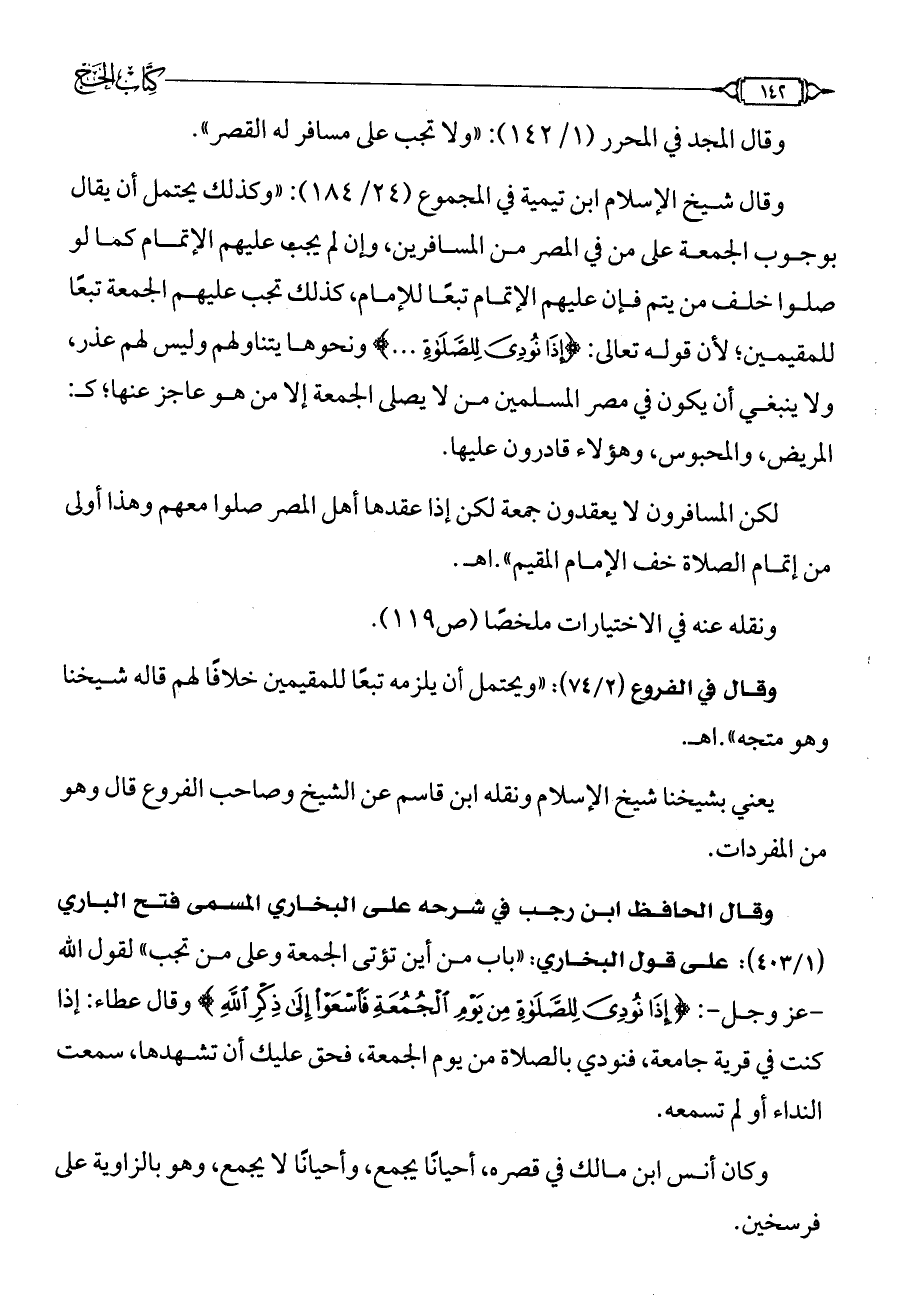 وقال المجد في المحرر (1/ 142): «ولا تجب على مسافر له القصر».