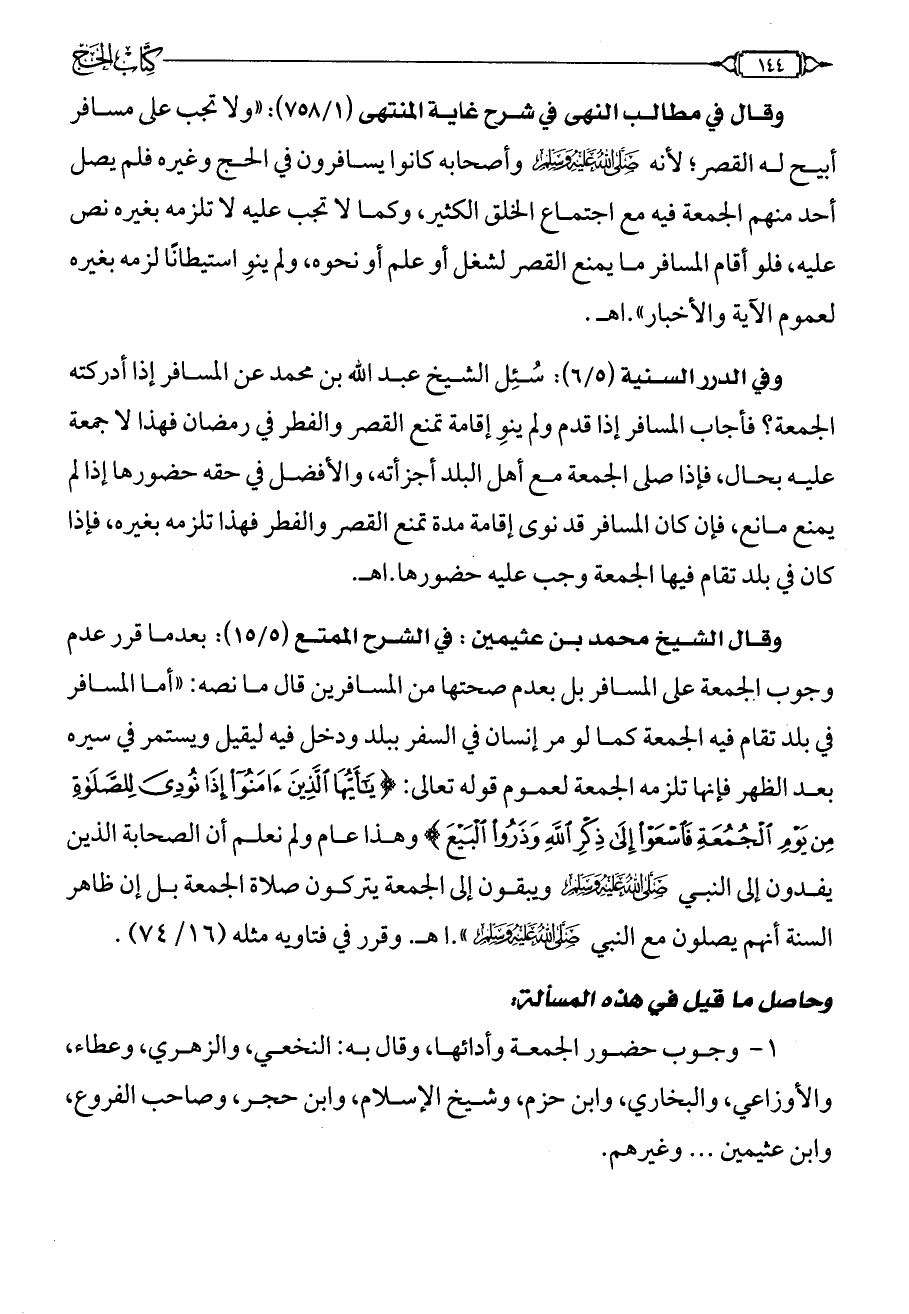 وقال الشيخ محمد بن عثيمين: في الشرح الممتع (5/ 15): بعدما قرر عدم وجوب الجمعة على المسافر بل بعدم صحتها من المسافرين قال ما نصه: «أما المسافر في بلد تقام فيه الجمعة كما لو مر إنسان في السفر ببلد ودخل فيه ليقيل ويستمر في سيره يعد الظهر فإنها تلزمه الجمعة لعموم قوله تعالى: {يَاأَيُّهَا الَّذِينَ آمَنُوا إِذَا نُودِيَ لِلصَّلَاةِ مِنْ يَوْمِ الْجُمُعَةِ فَاسْعَوْا إِلَى ذِكْرِ اللَّهِ وَذَرُوا الْبَيْعَ} وهذا عام ولم نعلم أن الصحابة الذين يفدون إلى النبي - صلى الله عليه وسلم - ويبقون إلى الجمعة يتركون صلاة الجمعة بل إن ظاهر السنة أنهم يصلون مع النبي - صلى الله عليه وسلم -». اهـ. وقرر في فتاويه مثله (16/ 74).