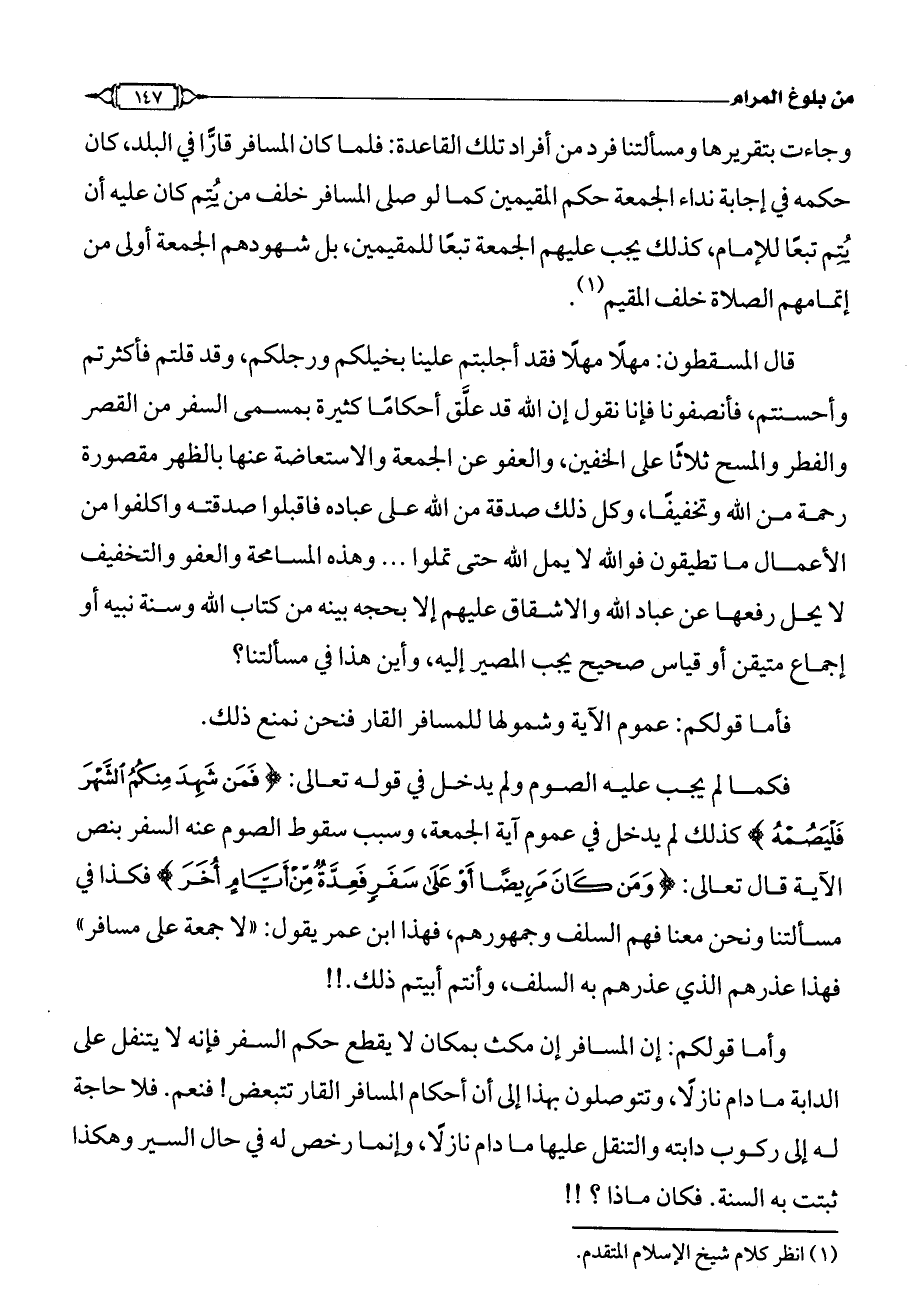 فكما لم يجب عليه الصوم ولم يدخل في قوله تعالى: {فَمَنْ شَهِدَ مِنْكُمُ الشَّهْرَ فَلْيَصُمْهُ} [البقرة: 185]، كذلك لم يدخل في عموم آية الجمعة، وسبب سقوط الصوم عنه السفر بنص الآية قال تعالى: {وَمَنْ كَانَ مَرِيضًا أَوْ عَلَى سَفَرٍ فَعِدَّةٌ مِنْ أَيَّامٍ أُخَرَ} فكذا في مسألتنا ونحن معنا فهم السلف وجمهورهم، فهذا ابن عمر يقول: «لا جمعة على مسافر» فهذا عذرهم الذي عذرهم به السلف، وأنتم أبيتم ذلك .. !!