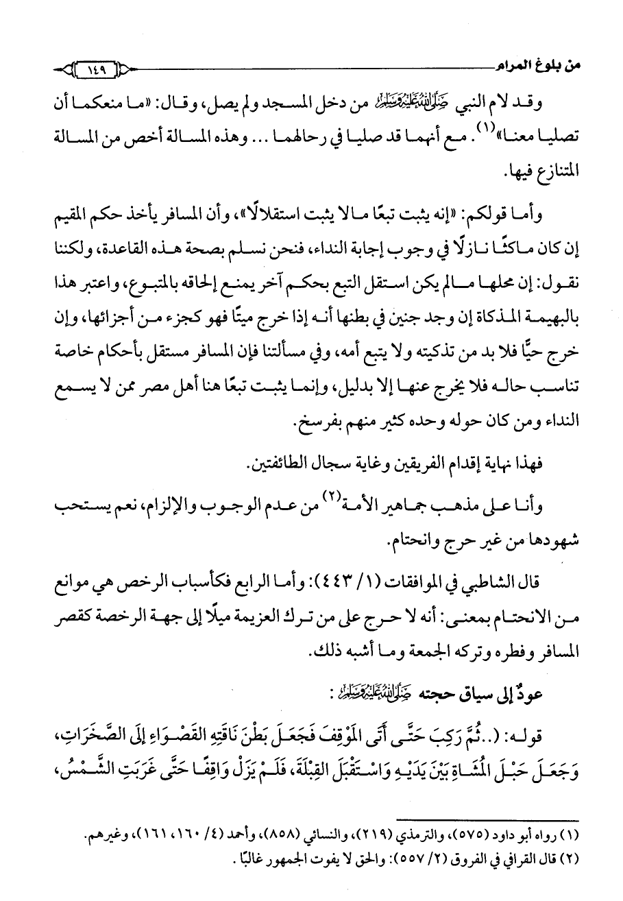 وأما قولكم: «إنه يثبت تبعًا ما لا يثبت استقلالًا»، وأن المسافر يأخذ حكم المقيم إن كان ماكثًا نازلًا في وجوب إجابة النداء، فنحن نسلم بصحة هذه القاعدة، ولكننا نقول: إن محلها ما لم يكن استقل التبع بحكم آخر يمنع إلحاقه بالمتبوع، واعتبر هذا بالبهيمة المذكاة إن وجد جنين في بطنها أنه إذا خرج ميتًا فهو كجزء من أجزائها، وإن خرج حيًّا فلا بد من تذكيته ولا يتبع أمه، وفي مسألتنا فإن المسافر مستقل بأحكام خاصة تناسب حاله فلا يخرج عنها إلا بدليل، وإنما يثبت تبعًا هنا أهل مصر ممن لا يسمع النداء ومن كان حوله وحده كثير منهم بفرسخ.
