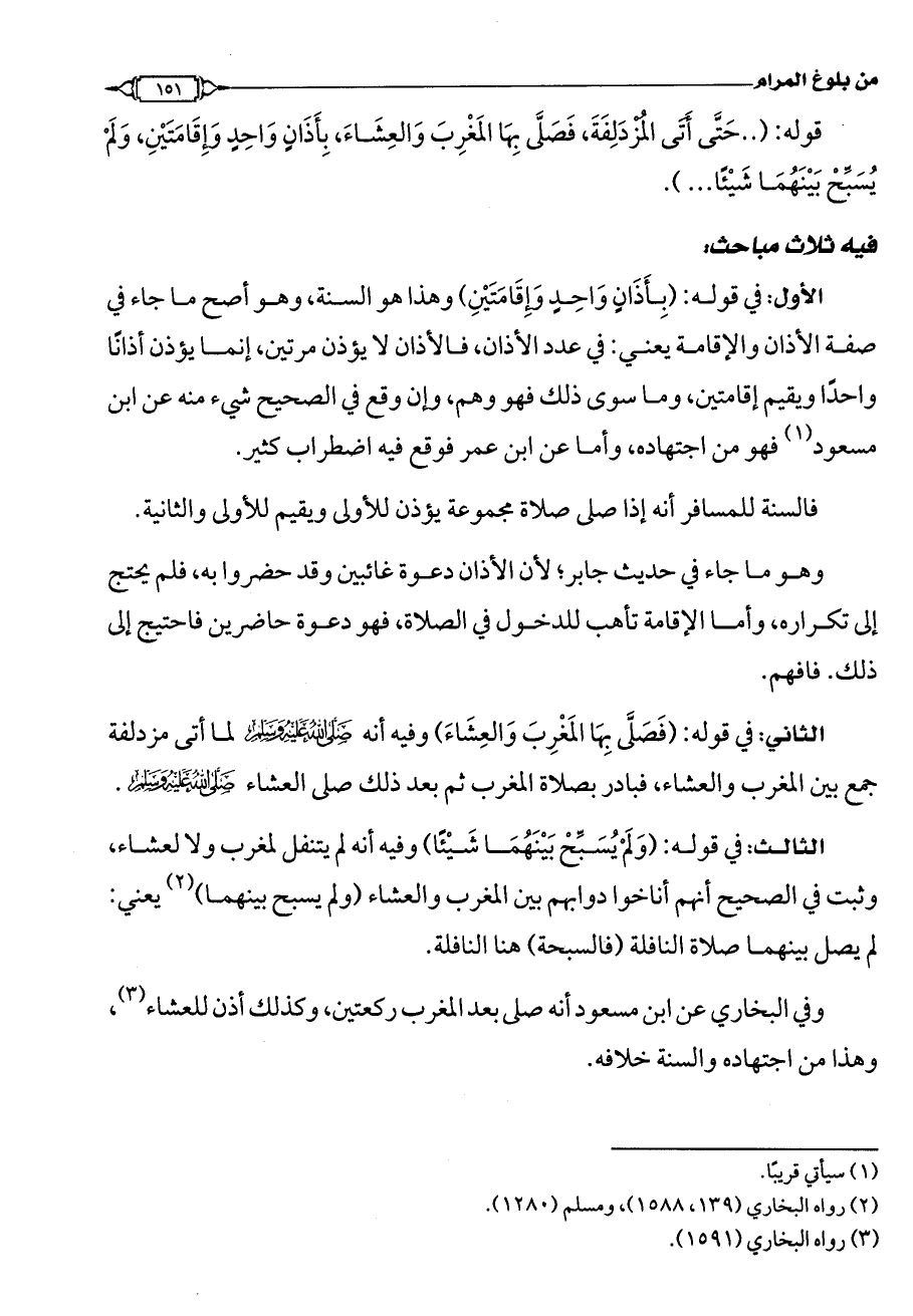 الأول: في قوله: (بِأَذَانٍ وَاحِدٍ وَإِقَامَتَيْنِ) وهذا هو السنة، وهو أصح ما جاء في صفة الأذان والإقامة يعني: في عدد الأذان، فالأذان لا يؤذن مرتين، إنما يؤذن أذانًا واحدًا ويقيم أقامتين، وما سوى ذلك فهو وهم، وإن وقع في الصحيح شيء منه عن ابن مسعود (¬1) فهو من اجتهاده، وأما عن ابن عمر فوقع اضطراب كثير.