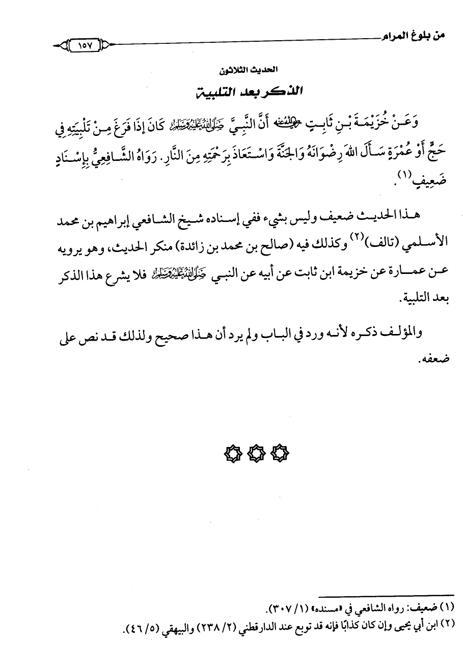 وَعَنْ خُزَيْمَةَ بْنِ ثَابِتٍ - رضي الله عنه - أَنَّ النَّبِيَّ - صلى الله عليه وسلم - كَانَ إذَا فَرَغَ مِنْ تَلْبِيَتِهِ فِي حَجٍّ أَوْ عُمْرَةٍ سَأَلَ اللهَ رِضْوَانَهُ وَالجَنَّةَ وَاسْتَعَاذَ بِرَحْمَتِهِ مِنَ النَّارِ. رَوَاهُ الشَّافِعِيُّ بِإِسْنَادٍ ضَعِيفٍ (¬1).