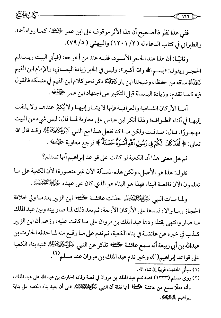 (¬2) روى مسلم (1333) قصة ندم عبد الملك بن مروان في قصة وفادة الحارث بن عبد الله على عبد الملك، وأنه فعلًا سمع من عائشة - رضي الله عنها - أنها نقلة أن النبي - صلى الله عليه وسلم - تمنى أن يعيد بناء الكعبة على بناية إبراهيم - عليه السلام -.