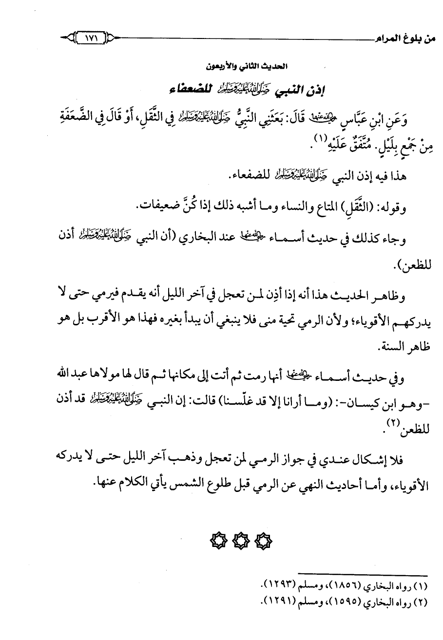 وَعَنِ ابْنِ عَبَّاسٍ - رضي الله عنهما - قَالَ: بَعَثَنِي النَّبِيُّ - صلى الله عليه وسلم - فِي الثَّقَلِ، أَوْ قَالَ فِي الضَّعَفَةِ مِنْ جَمْعٍ بِلَيْلٍ. [مُتَّفَقٌ عَلَيْهِ] (¬1).
