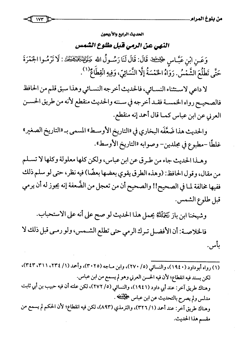وَعَنِ ابْنِ عَبَّاسٍ - رضي الله عنهما - قَالَ: قَالَ لَنَا رَسُولُ اللهِ - صلى الله عليه وسلم -: «لَا تَرْمُوا الجَمْرَةَ حَتَّى تَطْلُعَ الشَّمْسُ» [رَوَاهُ الخَمْسَةُ إلَّا النَّسَائِيّ، وَفِيهِ انْقِطَاعٌ] (¬1).