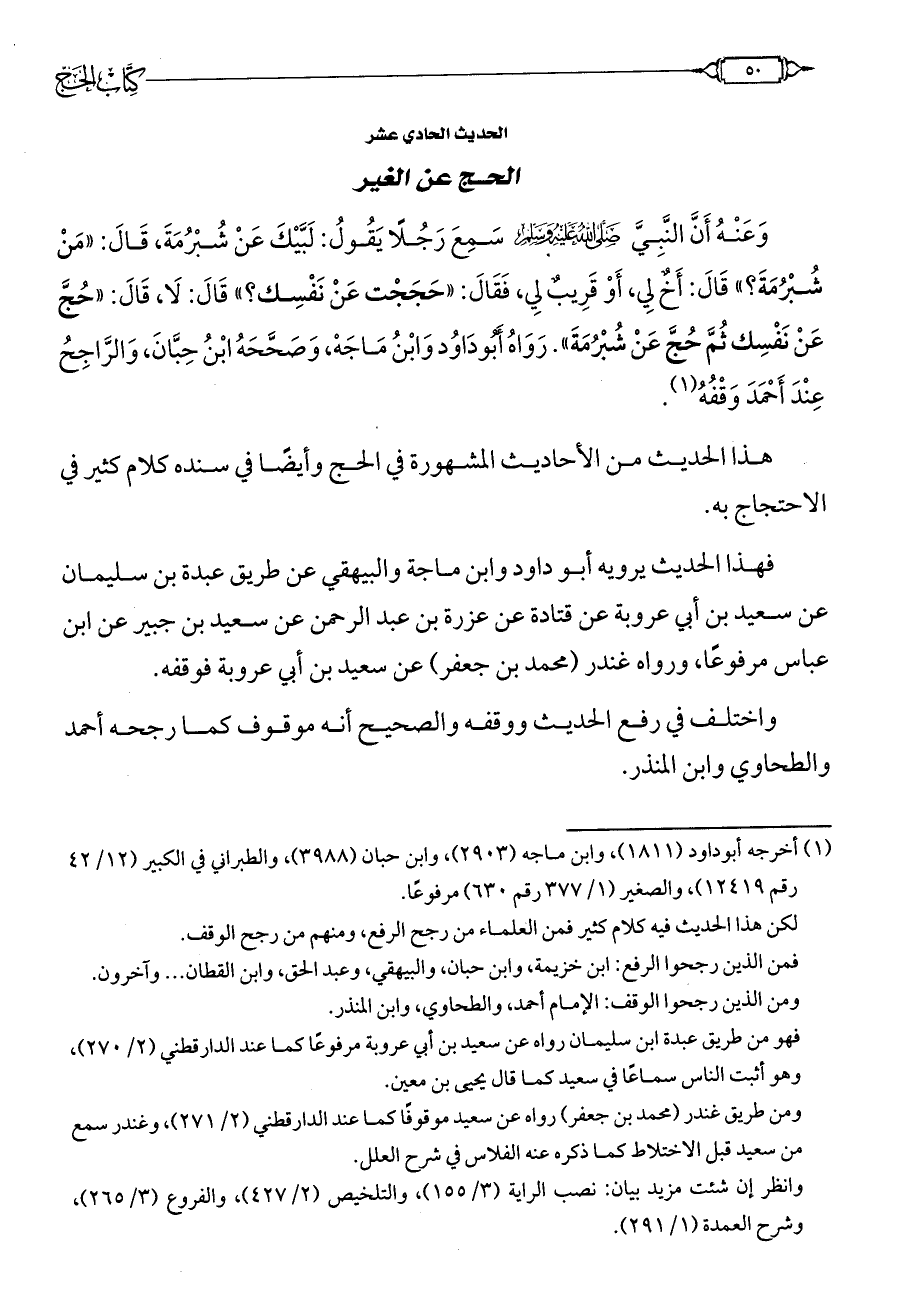وَعَنْهُ أَنَّ النَّبِيَّ - صلى الله عليه وسلم - سَمِعَ رَجُلًا يَقُولُ: لَبَّيْكَ عَنْ شُبْرُمَةَ، قَالَ: «مَنْ شُبْرُمَةَ؟» قَالَ: أَخٌ لِي، أَوْ قَرِيبٌ لِي، فَقَالَ: «حَجَجْت عَنْ نَفْسِك؟» قَالَ: لَا، قَالَ: «حُجَّ عَنْ نَفْسِك ثُمَّ حُجَّ عَنْ شُبْرُمَةَ» [رَوَاهُ أَبُو دَاوُد وَابْنُ مَاجَهْ، وَصَحَّحَهُ ابْنُ حِبَّانَ]، وَالرَّاجِحُ عِنْدَ أَحْمَدَ وَقْفُهُ (¬1).