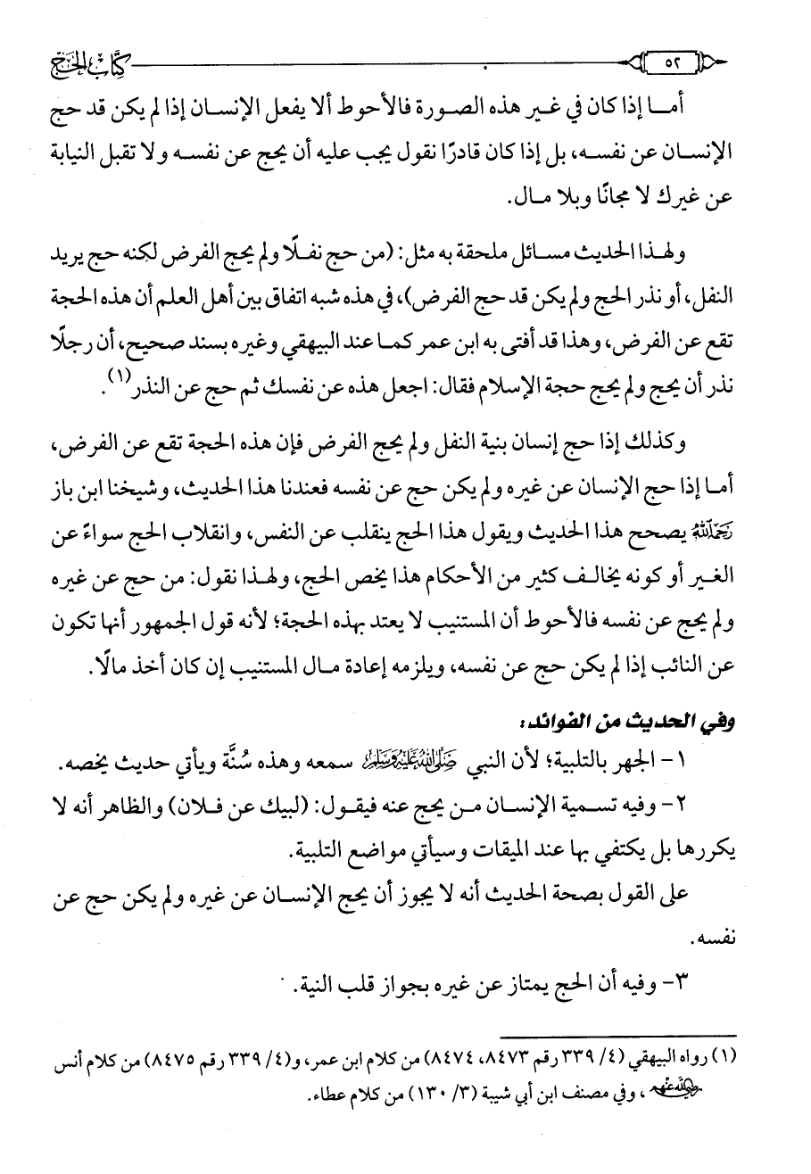 2 - وفيه تسمية الإنسان من يحج عنه فيقول: (لبيك عن فلان) والظاهر أنه لا يكررها بل يكتفي بها عند الميقات وسيأتي مواضع التلبية.