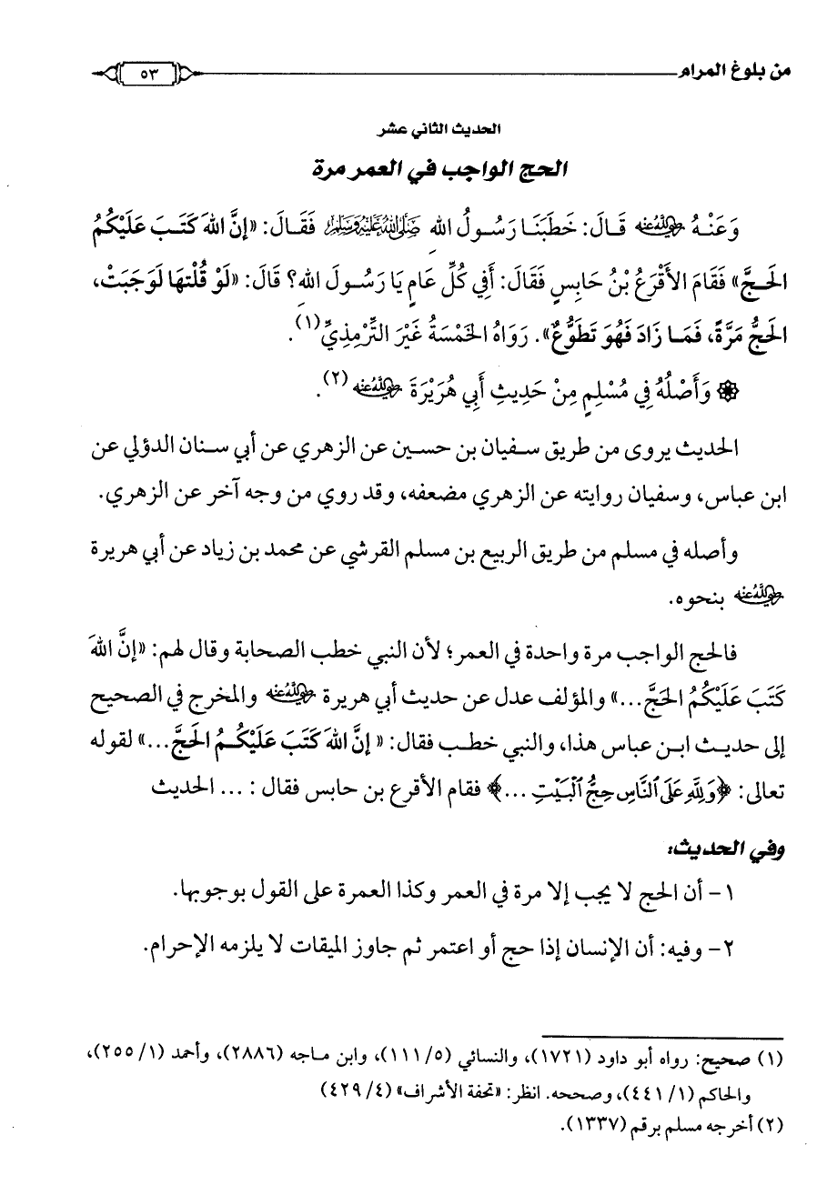 فالحج الواجب مرة واحدة في العمر؛ لأن النبي خطب الصحابة وقال لهم: «إنَّ اللهَ كَتَب عَلَيْكُمُ الحَجَّ ...» والمؤلف عدل عن حديث أبي هريرة - رضي الله عنه - والمخرج في الصحيح على حديث ابن عباس هذا، والنبي خطب فقال: «إنَّ اللهَ كَتَبَ عَلَيْكُمُ الحَجَّ ...» لقوله تعالى: {وَلِلَّهِ عَلَى النَّاسِ حِجُّ الْبَيْتِ ...} فقام الأقرع بن حابس فقال: ..... الحديث.