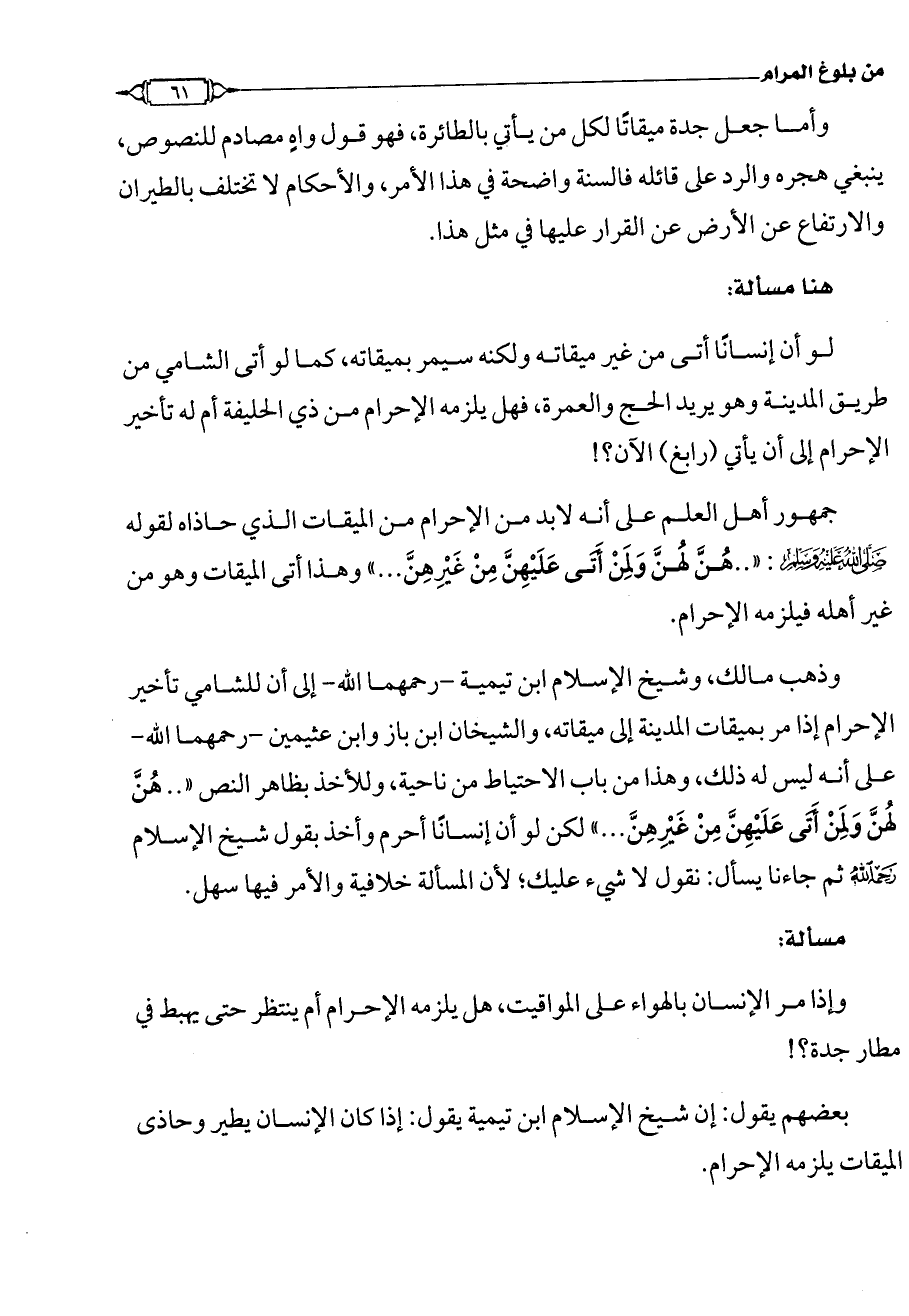 وذهب مالك، وشيخ الإسلام ابن تيمية - رحمها الله - إلى أن للشامي تأخير الإحرام إذا مر بميقات المدينة إلى ميقاته، والشيخان ابن باز وابن عثيمين - رحمها الله - على أنه ليس له ذلك، وهذا من باب الاحتياط من ناحية، وللأخذ بظاهر النص «... هُنَّ لَهُنَّ وَلِمَنْ أَتَى عَلَيْهِنَّ مِنْ غَيْرِهنَّ ...» لكن لو أن إنسانًا أحرم وأخذ بقول شيخ الإسلام - رحمه الله - ثم جاءنا يسأل: نقول لا شيء عليك؛ لأن المسألة خلافية والأمر فيها سهل.