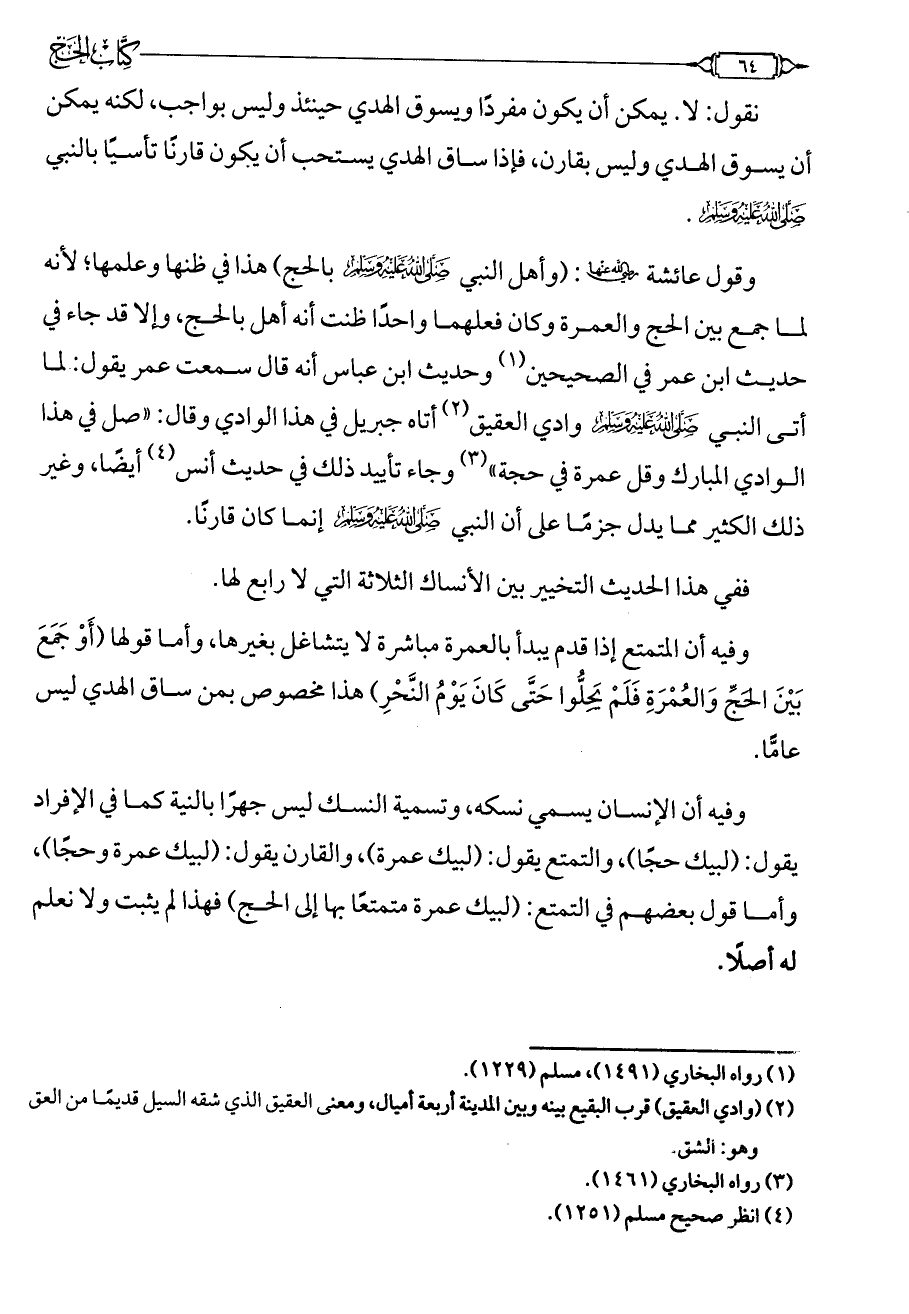 وفيه أن الإنسان يسمي نسكه، وتسمية النسك ليس جهرًا بالنية كما في الإفراد يقول: (لبيك حجًا)، والتمتع يقول: (لبيك عمرة)، والقارن يقول: (لبيك عمرة وحجًا)، وأما قول بعضهم في التمتع: (لبيك عمرة متمتعًا بها إلى الحج) فهذا لم يثبت ولا نعلم له أصلًا.