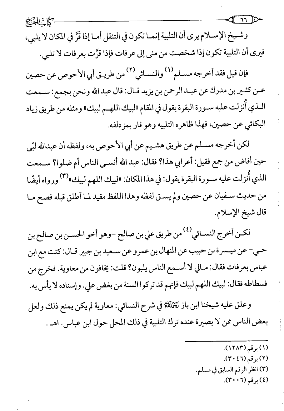 لكن أخرجه مسلم عن طريق هشيم عن أبي الأحوص به، ولفظه أن عبد الله لبّى حين أفاض من جمع فقيل: أعرابي هذا؟ فقال: عبد الله أنسى الناس أم ضلوا؟ سمعت الذي أُنزلت عليه سورة البقرة يقول: في هذا المكان: «لبيك اللهم لبيك» (¬3) ورواه أيضًا من حديث سفيان عن حصين ولم يسق لفظه وهذا اللفظ مقيد لما أطلق قبله فصح ما قال شيخ الإسلام.