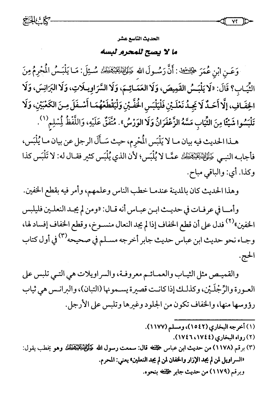 وَعَنِ ابْنِ عُمَرَ - رضي الله عنهما -: أَنَّ رَسُولَ اللهِ - صلى الله عليه وسلم - سُئِلَ: مَا يَلْبَسُ الُمحْرِمُ مِنَ الثِّيَابِ؟ قَالَ: «لَا يَلْبَسُ القَمِيصَ، وَلَا العَمَائِمَ، وَلَا السَّرَاوِيلَاتِ، وَلَا البَرَانِسَ، وَلَا الخِفَافِ، إلَّا أَحَدٌ لَا يَجِدُ نَعْلَيْنِ فَلْيَلْبَسِ الخُفَّيْنِ وَلْيَقْطَعْهُمَا أَسْفَلَ مِنَ الكَعْبَيْنِ، وَلَا تَلْبَسُوا شَيْئًا مِنَ الثِّيَابِ مَسَّهُ الزَّعْفَرَانُ وَلَا الوَرْسُ» [مُتَّفَقٌ عَلَيْهِ]، وَاللَّفْظُ لِمُسْلِمٍ (¬1).