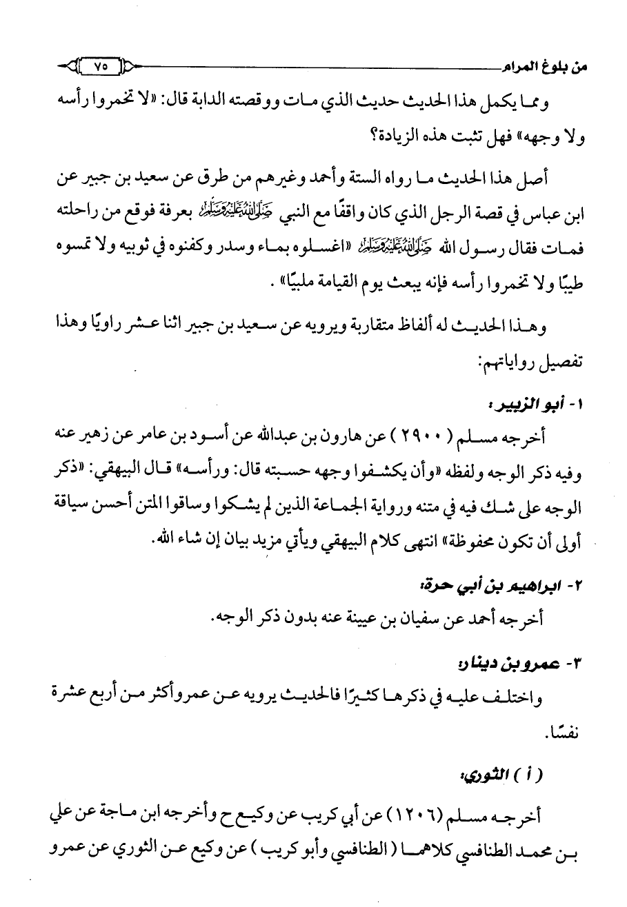 ومما يكمل هذا الحديث حديث الذي مات ووقصته الدابة قال: «لا تخمروا رأسه ولا وجهه» فهل تثبت هذه الزيادة؟