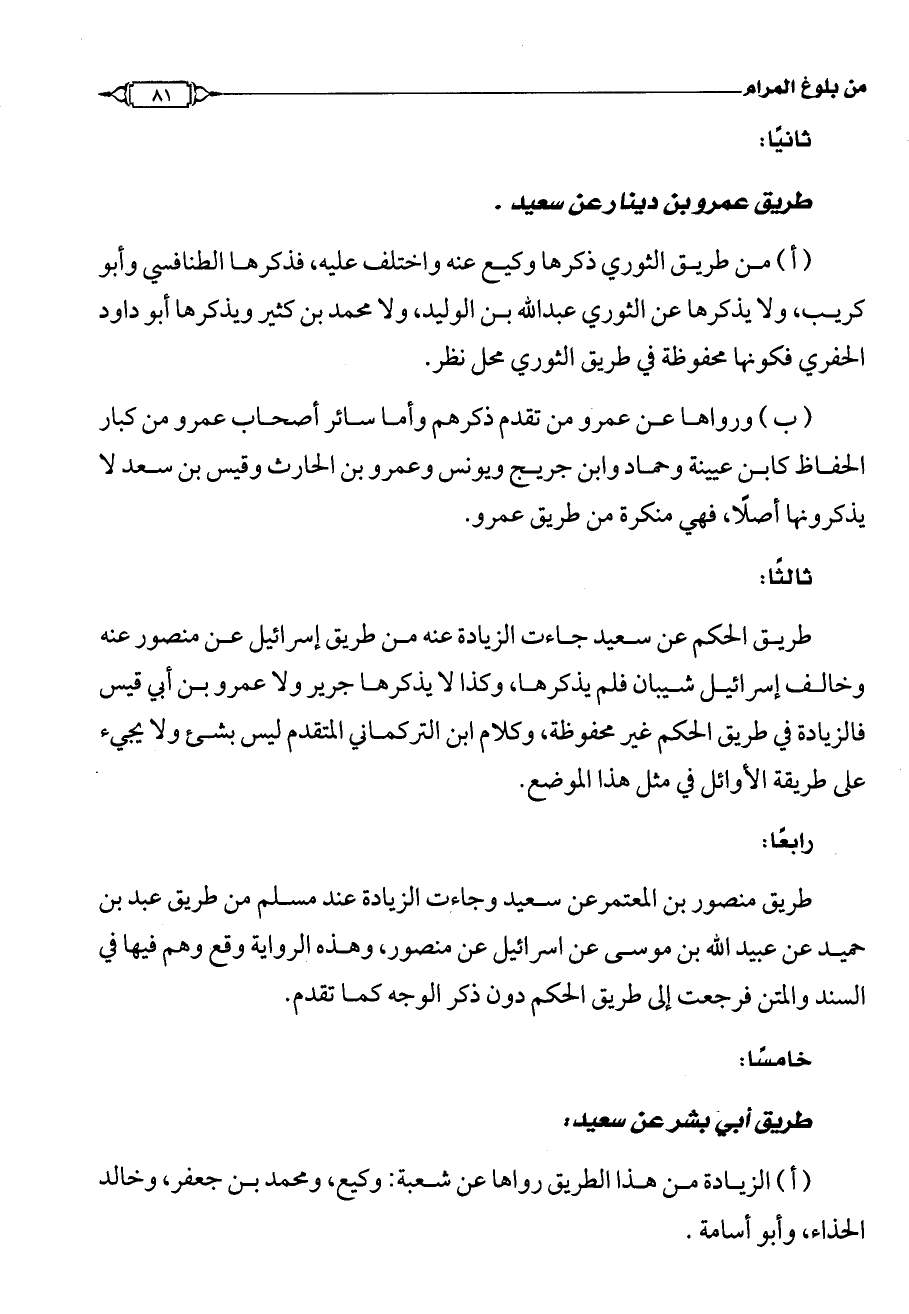 (ب) ورواها عن عمرو من تقدم ذكرهم وأما سائر أصحاب عمرو من كبار الحفاظ كابن عيينة وحماد وابن جريح ويونس وعمرو بن الحارث وقيس بن سعد لا يذكرونها أصلًا، فهي منكرة من طريق عمرو.