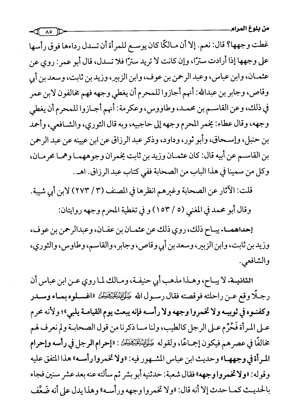 غطت وجهها؟ قال: نعم. إلا أن مالكًا كان يوسع للمرأة أن تسدل رداءها فوق رأسها على وجهها إذا أرادت سترًا، وإن كانت لا تريد سترًا فلا تسدل، قال أبو عمر: روي عن عثمان، وابن عباس، وعبد الرحمن بن عوف، وابن الزبير، وزيد بن ثابت، وسعد بن أبي وقاص، وجابر بن عبد الله: أنهم أجازوا للمحرم أن يغطي وجهه فهم مخالفون لابن عمر في ذلك، وعن القاسم بن محمد، وطاووس، وعكرمة: أنهم أجازوا للمحرم أن يغطي وجهه، وقال عطاء: يخمر المحرم وجهه إلى حاجبيه، وبه قال الثوري، والشافعي، وأحمد بن حنبل، وإسحاق، وأبو ثور، وداود، وذكر عبد الرزاق عن ابن عيينه عن عبد الرحمن بن القاسم عن أبيه قال: كان عثمان وزيد بن ثابت يخمران وجوههما وهما محرمان، وكل من سمينا في هذا الباب من الصحابة ففي كتاب عبد الرزاق. اهـ.
