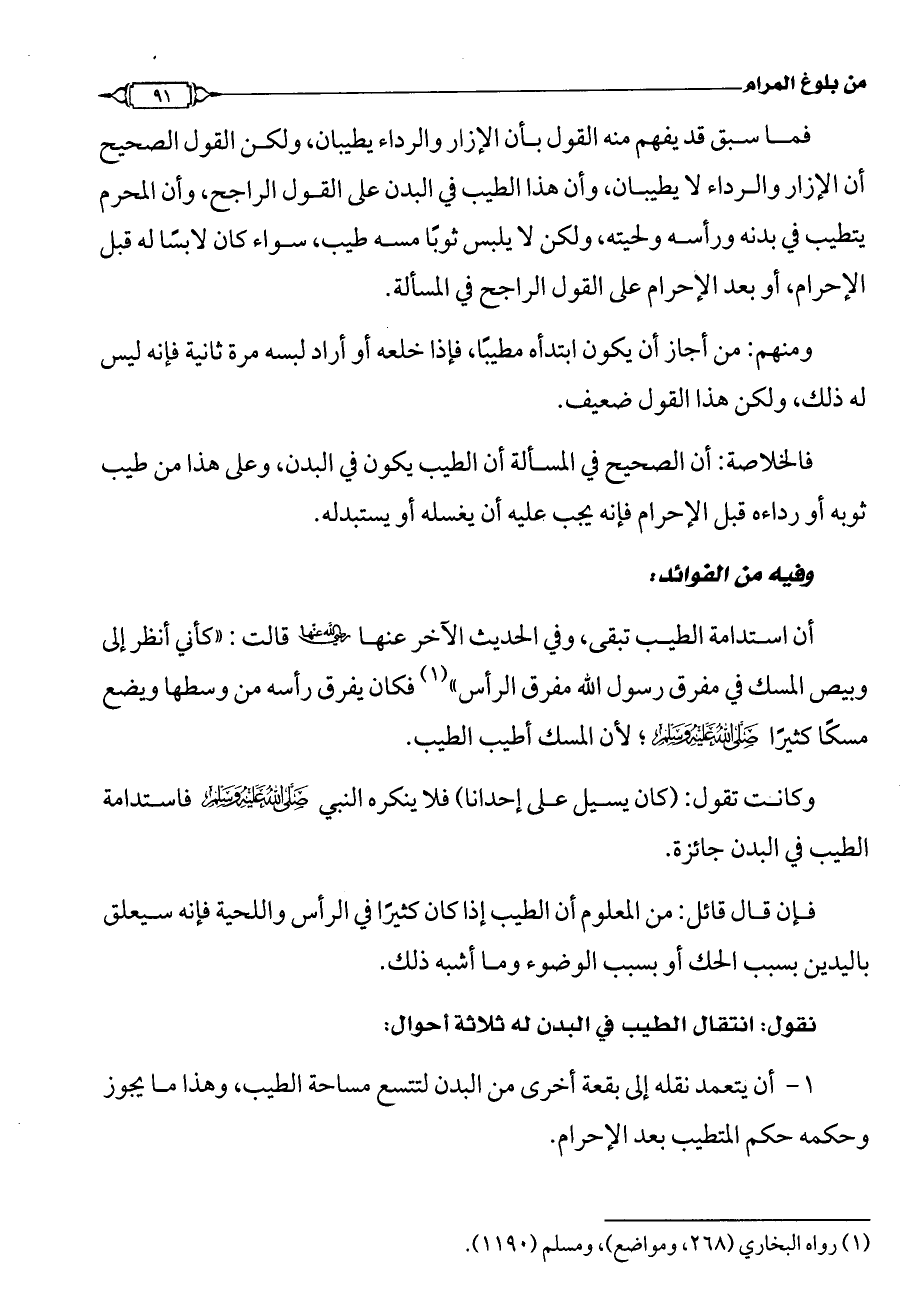 فما سبق قد يفهم منه القول بأن الإزار والرداء يطيبان، ولكن القول الصحيح أن الإزار والرداء لا يطيبان، وأن هذا الطيب في البدن على القول الراجح، وأن المحرم يتطيب في بدنه ورأسه ولحيته، ولكن لا يلبس ثوبًا مسه طيب، سواء كان لا بسًا له قبل الإحرام، أو بعد الإحرام على القول الراجح في المسألة.