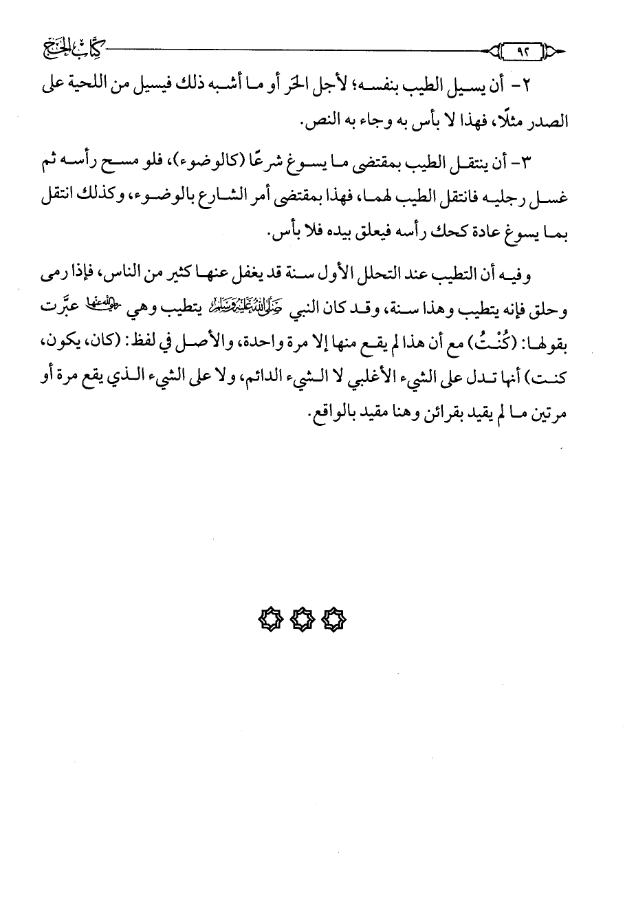3 - أن ينتقل الطيب بمقتضى ما يسوغ شرعًا (كالوضوء)، فلو مسح رأسه ثم غسل رجليه فانتقل الطيب لهما، فهذا بمقتضى أمر الشارع بالوضوء، وكذلك انتقل بما يسوغ عادة كحك رأسه فيعلق بيده فلا بأس.