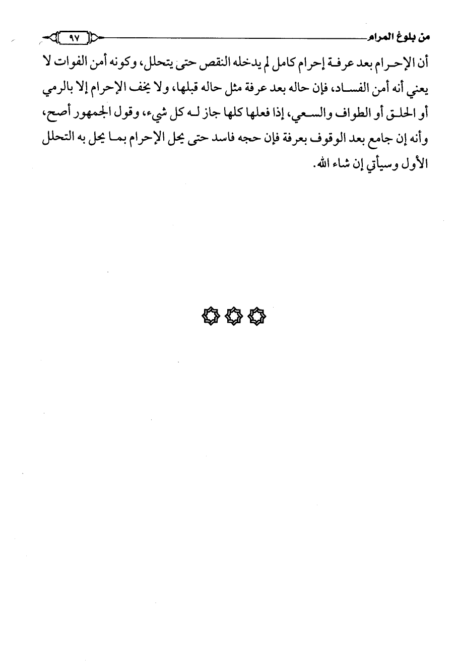 عرفة إحرام كامل لم يدخله النقص حتى يتحلل، وكونه أمن الفوات لا يعني أنه أمن الفساد، فإن حاله بعد عرفة مثل حاله قبلها، ولا يخف الإحرام إلا بالرمي أو الحلق أو الطواف والسعي، إذا فعلها كلها جاز له كل شيء، وقول الجمهور أصح، وأنه إن جامع بعد الوقوف بعرفة فإن حجه فاسد حتى يحل الإحرام بما يحل به التحلل الأول وسيأتي إن شاء الله.