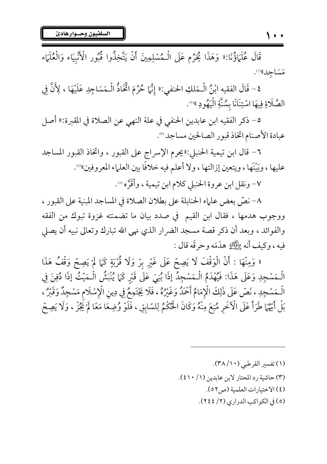 8 - نصّ بعض علماء الحنابلة على بطلان الصلاة في المساجد المبنية على القبور، ووجوب هدمها، فقال ابن القيم في صدد بيان ما تضمنته غزوة تبوك من الفقه والفوائد، وبعد أن ذكر قصة مسجد الضرار الذي نهى الله - تبارك وتعالى - نبيه أن يصلي فيه، وكيف أنه - صلى الله عليه وآله وسلم - هدَمَه وحرقَه قال: