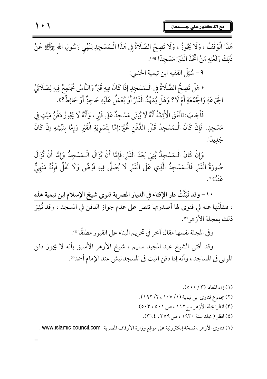 10 - وقد تَبَنَّتْ دار الإفتاء في الديار المصرية فتوى شيخ الإسلام ابن تيمية هذه، فنقلَتْها عنه في فتوى لها أصدرتها تنص على عدم جواز الدفن في المسجد، وقد نُشِرَ ذلك بمجلة الأزهر (3). (¬3)