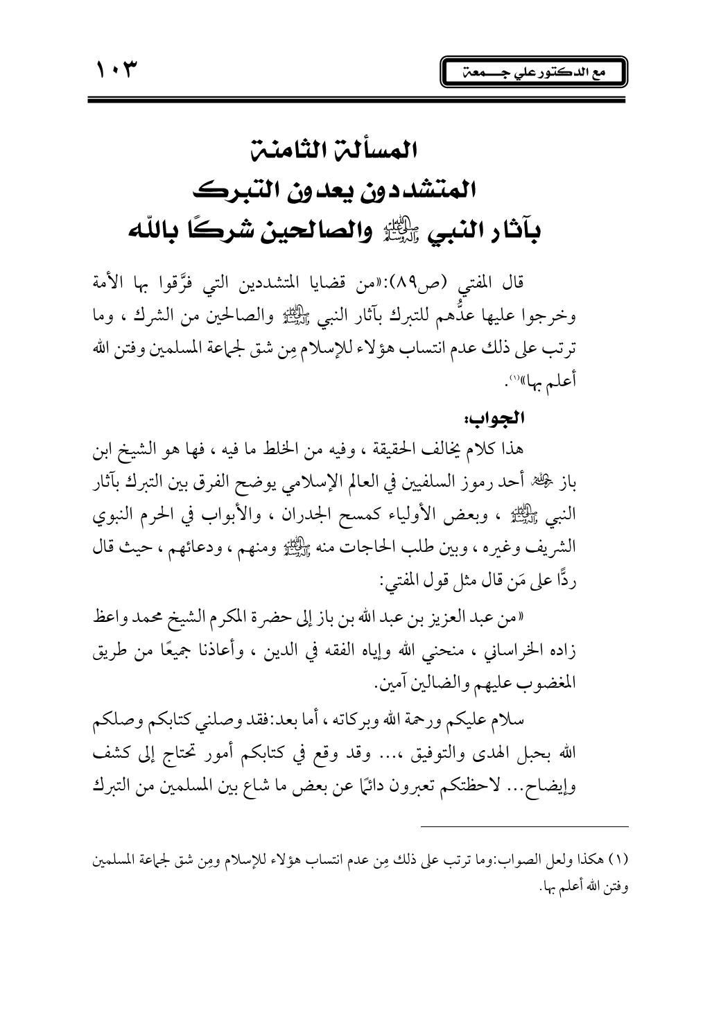 سلام عليكم ورحمة الله وبركاته , أما بعد: فقد وصلني كتابكم وصلكم الله بحبل الهدى والتوفيق ... وقد وقع في كتابكم أمور تحتاج إلى كشف وإيضاح ... لاحظتكم تعبرون دائمًا عن بعض ما شاع بين المسلمين من