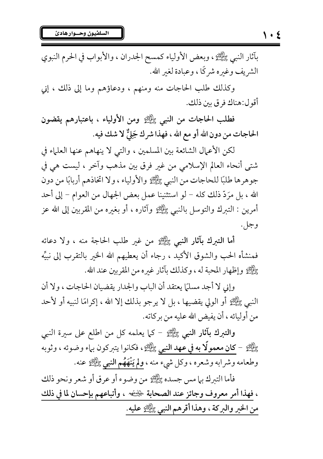 وإني لا أجد مسلمًا يعتقد أن الباب والجدار يقضيان الحاجات , ولا أن النبي - صلى الله عليه وآله وسلم - أو الولي يقضيها , بل لا يرجو بذلك إلا الله , إكرامًا لنبيه أو لأحد من أوليائه , أن يفيض الله عليه من بركاته.