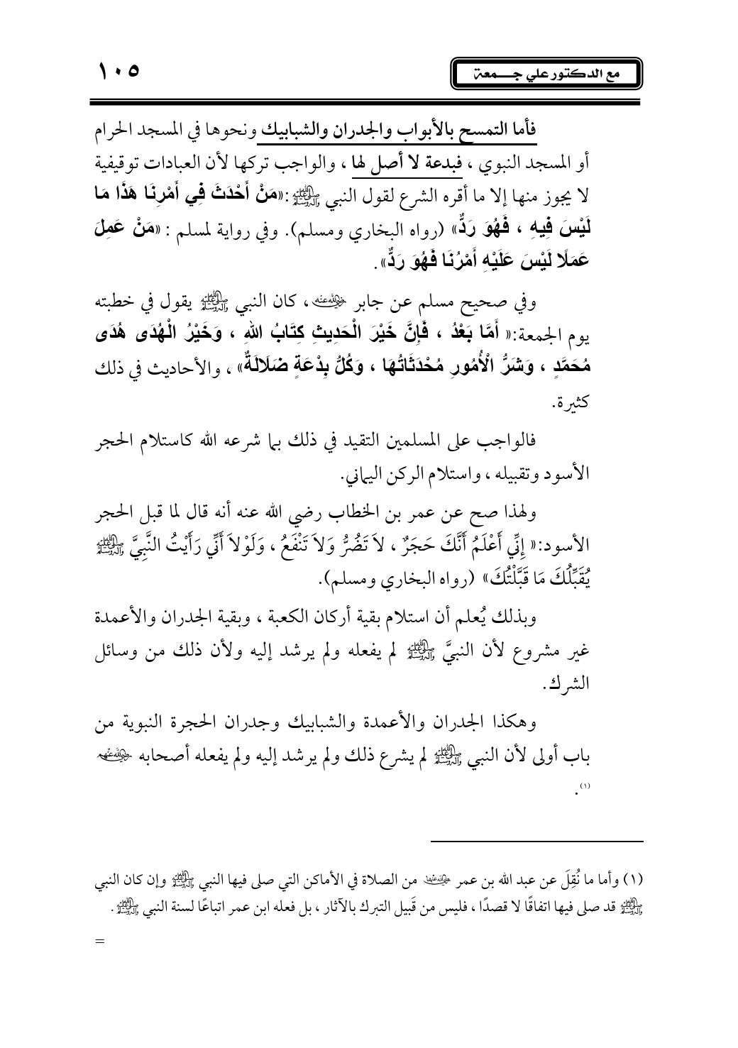 فأما التمسح بالأبواب والجدران والشبابيك ونحوها في المسجد الحرام أو المسجد النبوي , فبدعة لا أصل لها , والواجب تركها لأن العبادات توقيفية لا يجوز منها إلا ما أقره الشرع لقول النبي - صلى الله عليه وآله وسلم -: «مَنْ أَحْدَثَ فِي أَمْرِنَا هَذَا مَا لَيْسَ فِيهِ، فَهُوَ رَدٌّ» (رواه البخاري ومسلم). وفي رواية لمسلم: «مَنْ عَمِلَ عَمَلًا لَيْسَ عَلَيْهِ أَمْرُنَا فَهُوَ رَدٌّ».